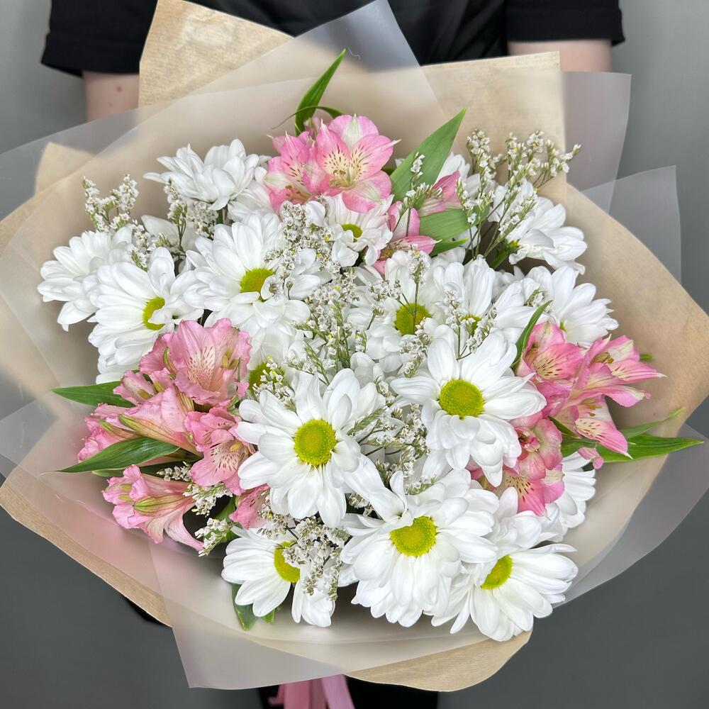Хризантема кустовая ромашковая – 4 шт.Альстромерия – 3 шт.Лимониум – 1 шт.Упаковка дизайнерская – 1 шт.Лента атласная – 1 шт.