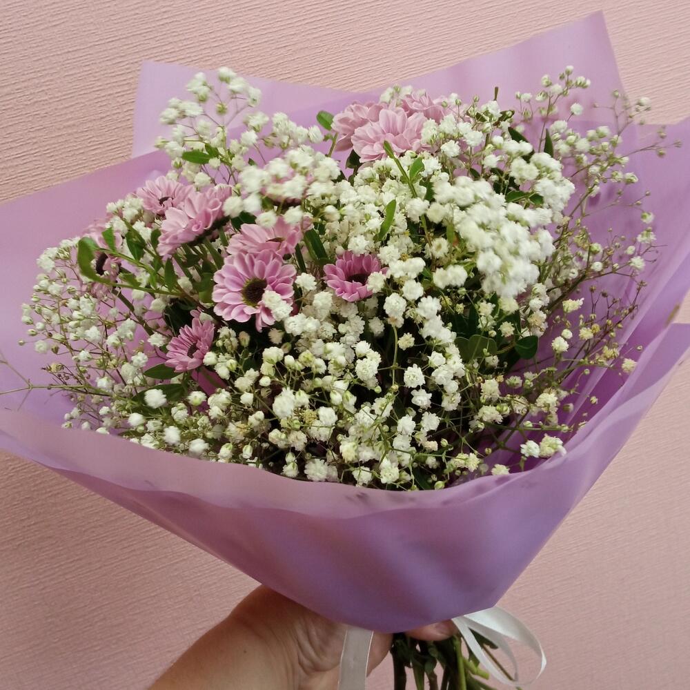 Гипсофила – 3 шт.Лента – 1 шт.Хризантема Сантини – 3 шт.Упаковка – 1 шт.зелень декоративная – 1 шт.