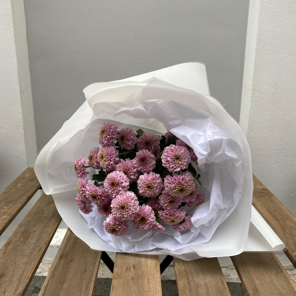 хризантема кустовая помпон – 5 шт.Тишью – 2 шт.Упаковка дизайнерская – 4 шт.Лента атласная – 1 шт.