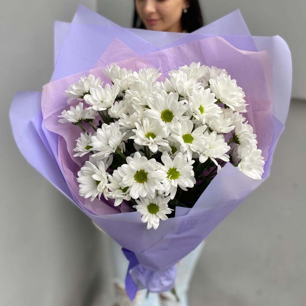 Лента атласная – 1 шт.Упаковка дизайнерская – 1 шт.хризантема кустовая чик – 5 шт.