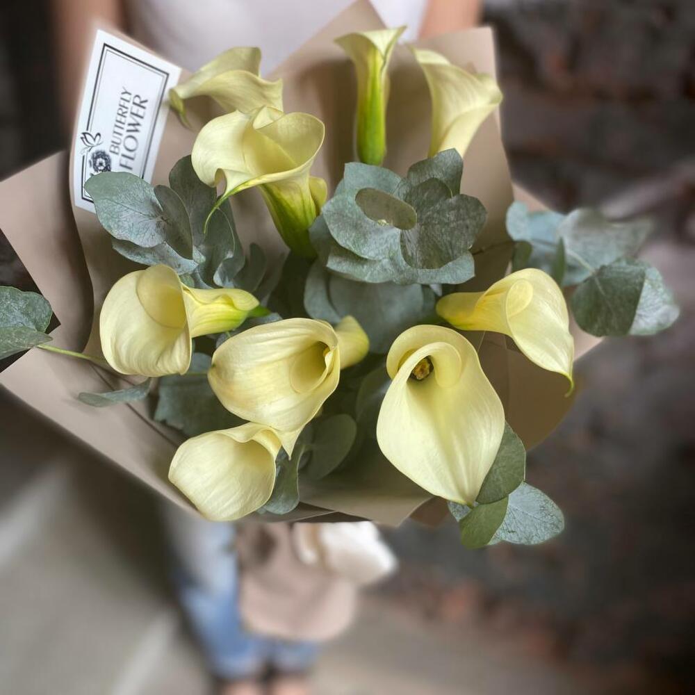 Букет из 9 белых калл с эвкалиптом в упаковке “Весенний туман”