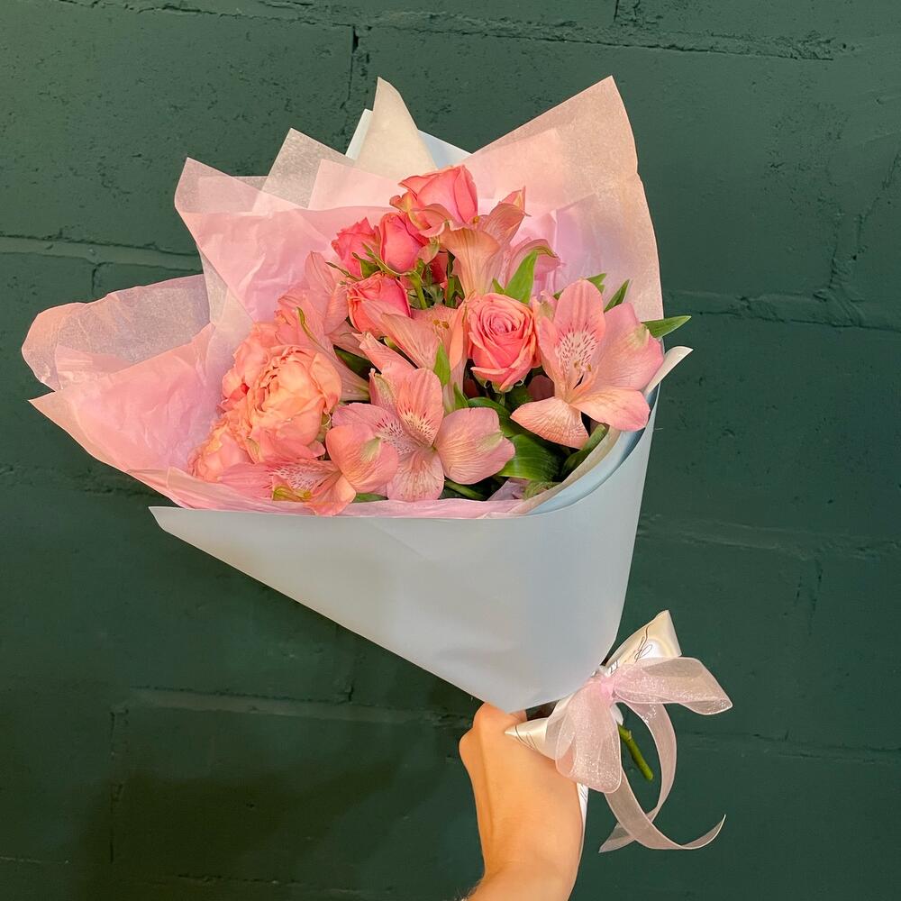 Роза кустовая пионовидная – 1 шт.Роза кустовая – 1 шт.Альстромерия – 1 шт.Упаковка дизайнерская – 1 шт.