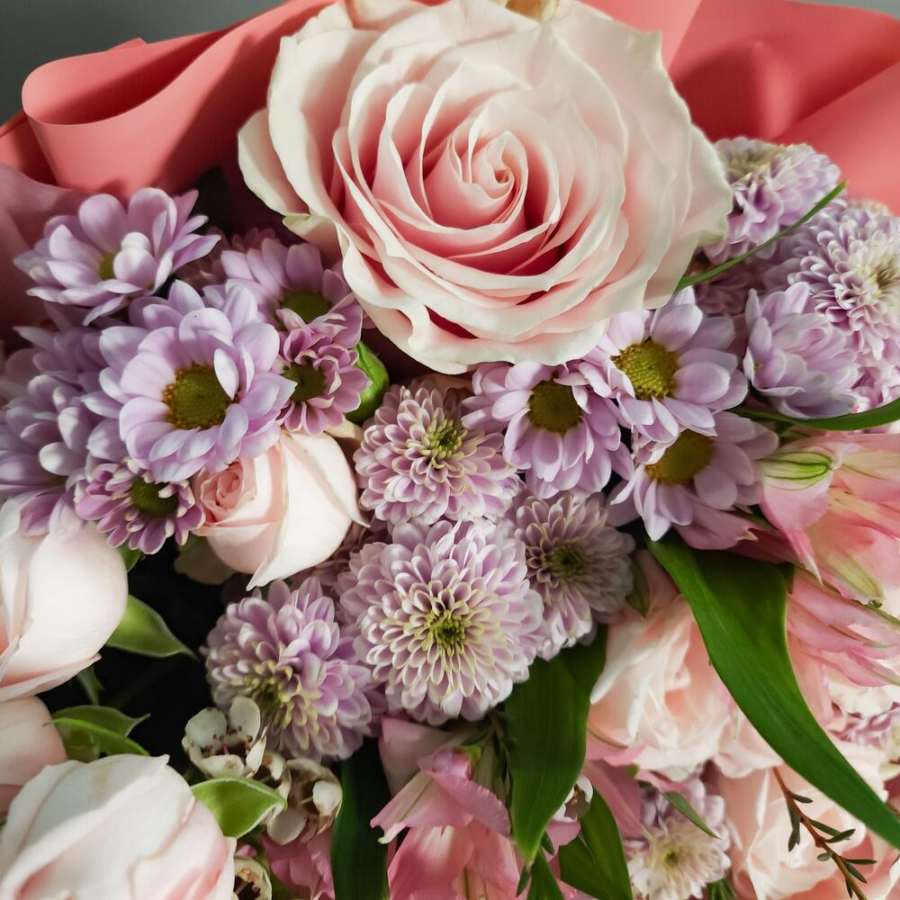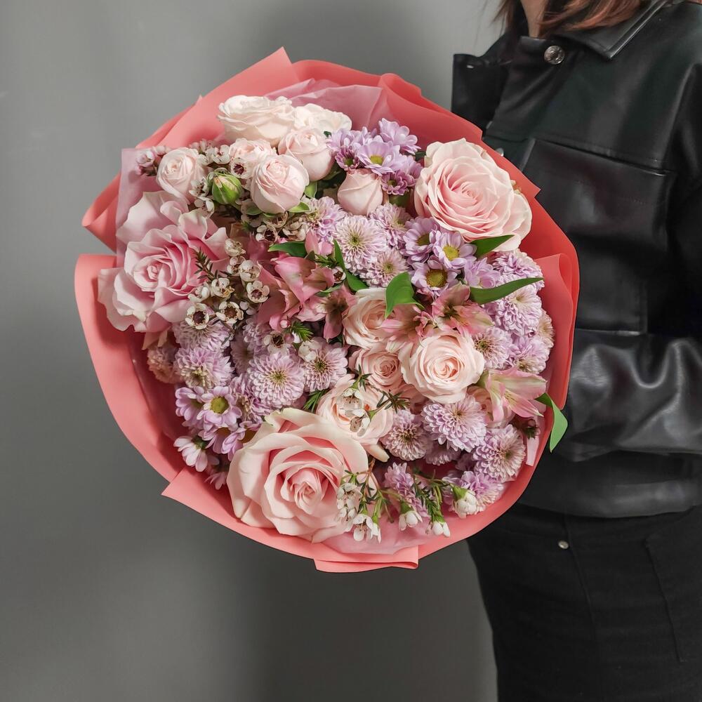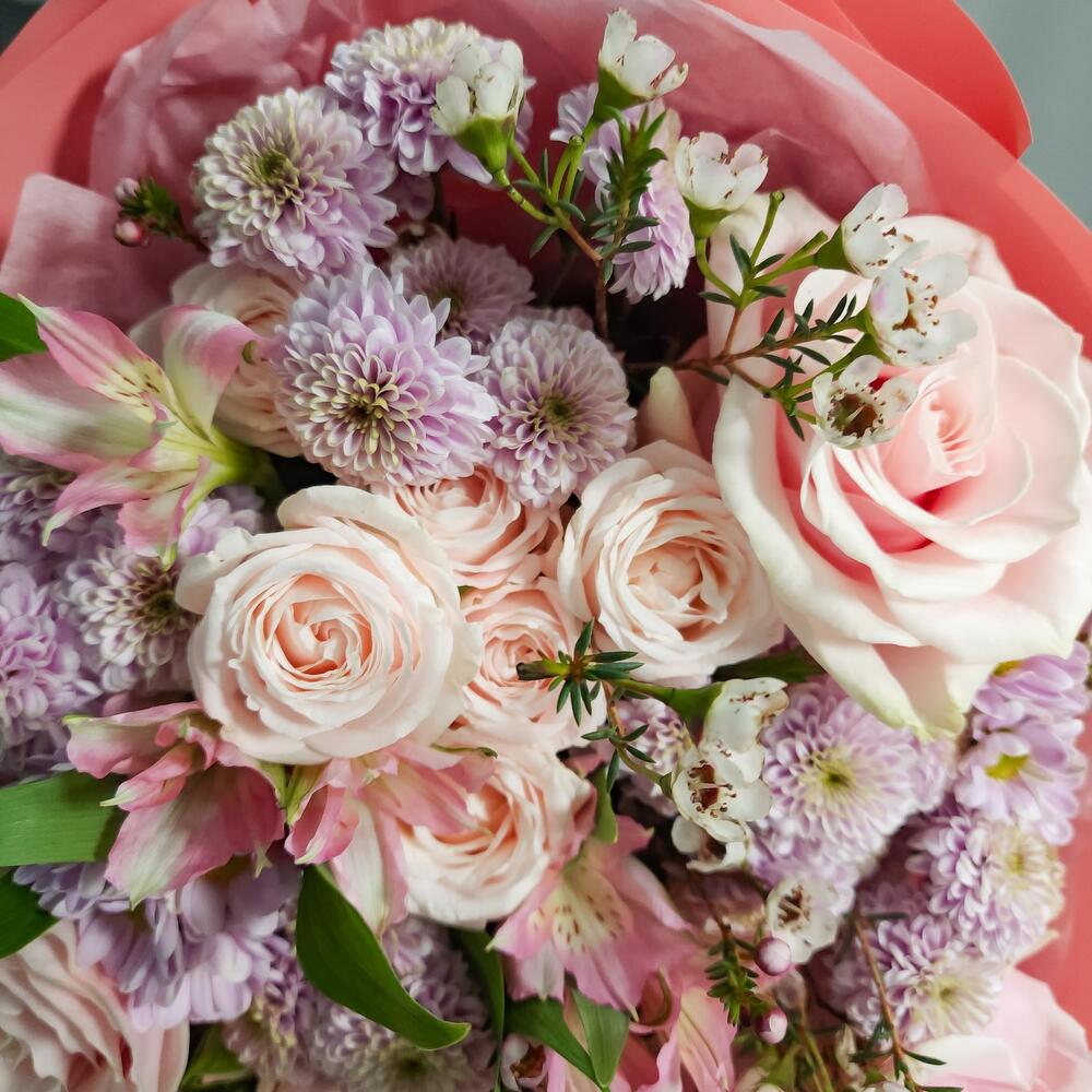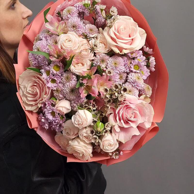 Альстромерии, Кустовые розы, Лизиантусы, Пионовидные розы, Розы, Ромашки