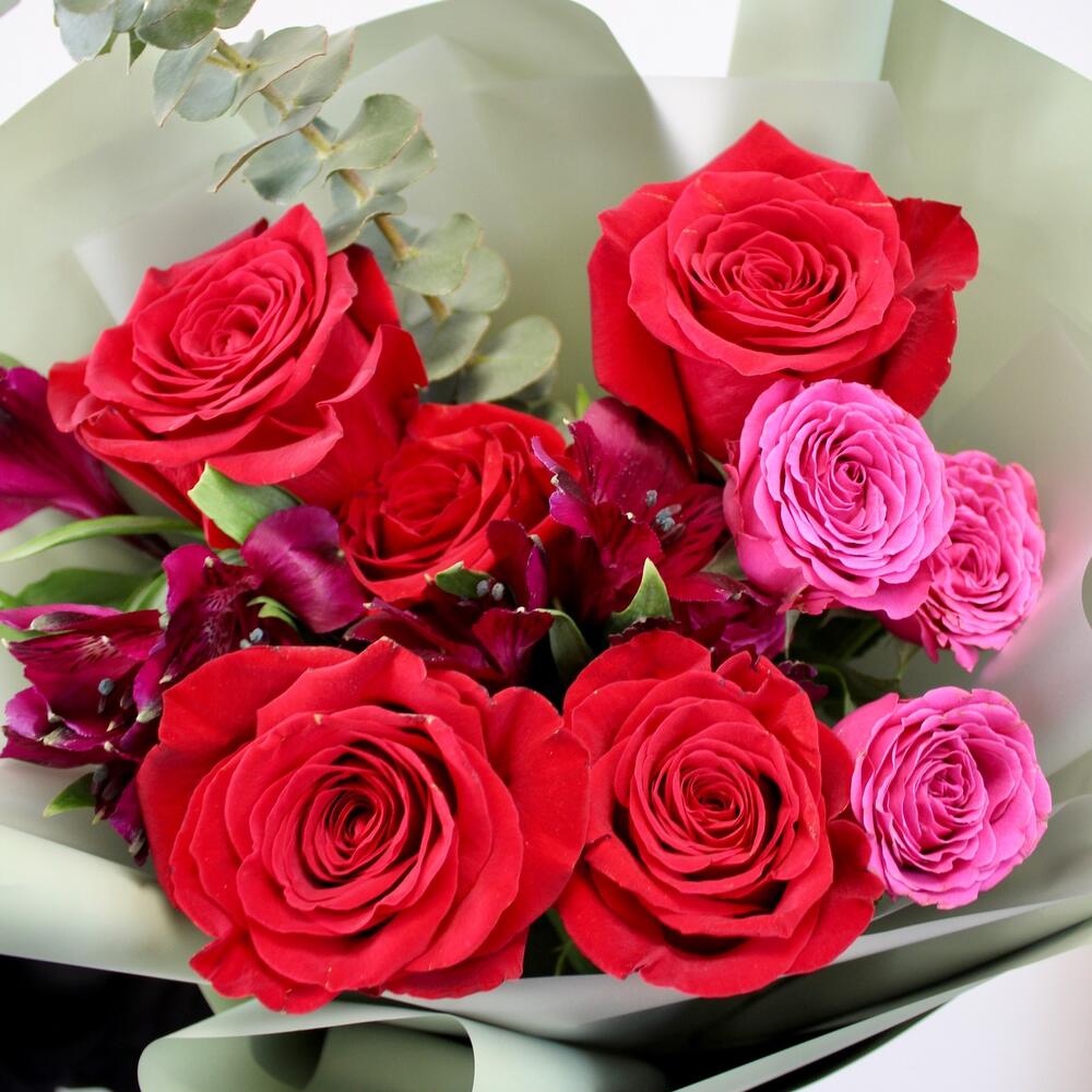 Роза Эквадор – 5 шт.Роза кустовая – 1 шт.Альстромерия – 2 шт.Эвкалипт – 1 шт.Упаковка дизайнерская – 2 шт.
