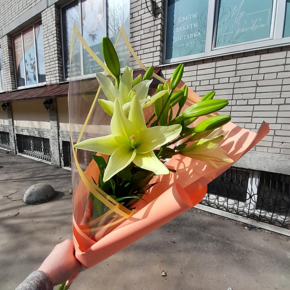 Лилия Азиатская белая – 3 шт.Упаковка дизайнерская – 3 шт.Лента атласная – 2 шт.