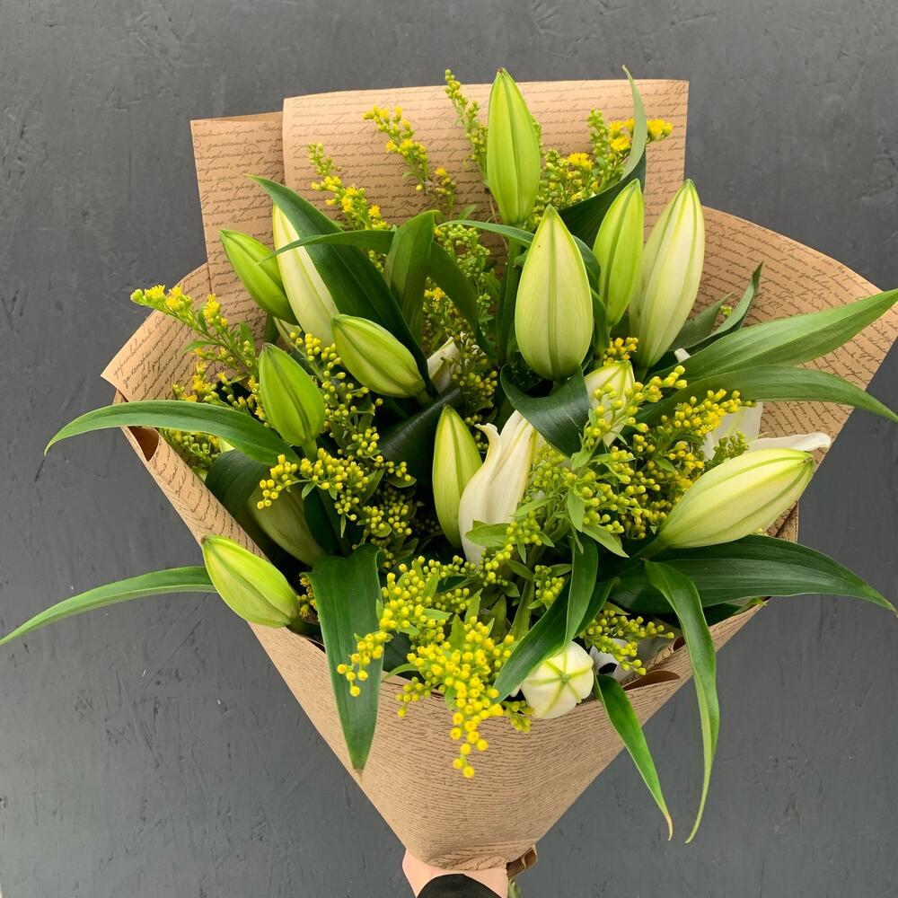 Букет из 5 белых лилий и солидаго в крафте