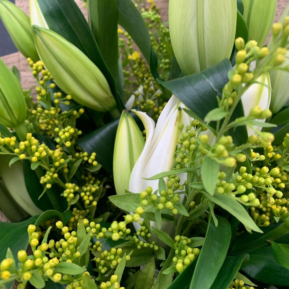 Лилия – 5 шт.Солидаго – 3 шт.Упаковка дизайнерская – 2 шт.Лента атласная – 2 шт.