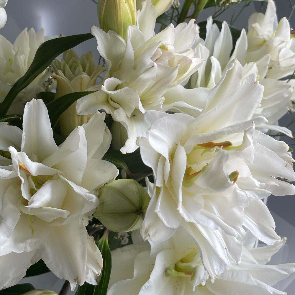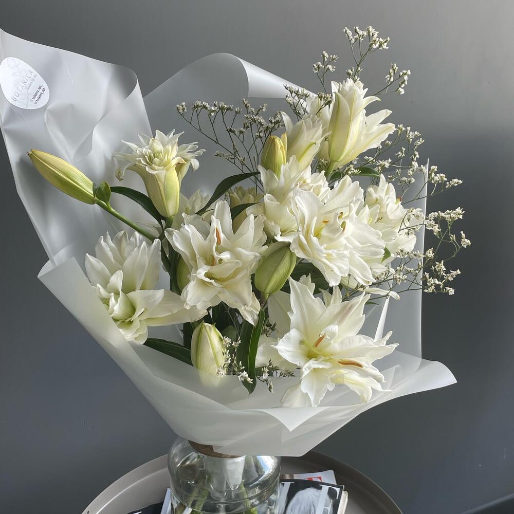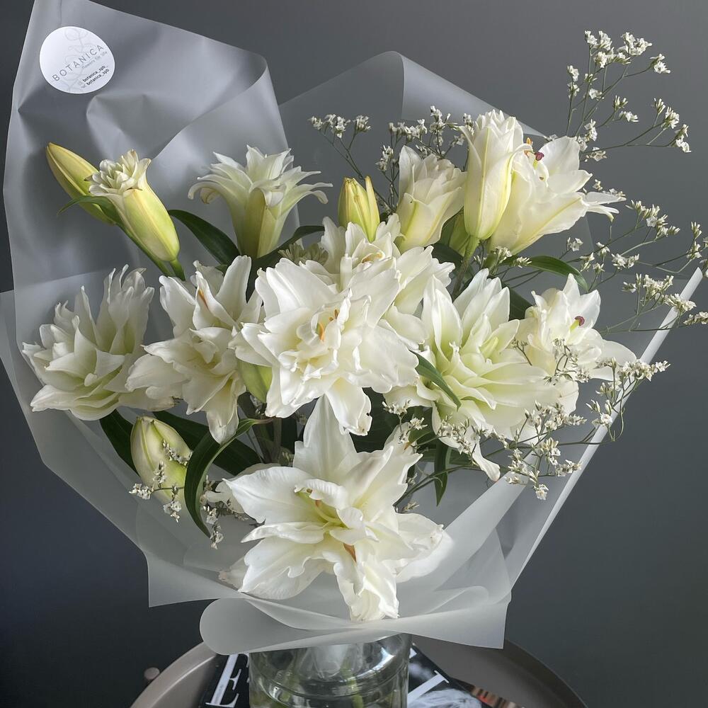 Лимониум – 1 шт.Лента атласная – 1 шт.Лилия белая – 5 шт.Пленка матовая – 4 шт.