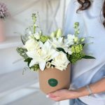 Вибурнум – 3 шт.Лизиантус – 4 шт.Маттиола – 2 шт.Шляпная коробка – 1 шт.Скиммия – 3 шт.Гринбелл – 2 шт.Оазис флористический – 1 шт.лилия дабл – 2 шт.