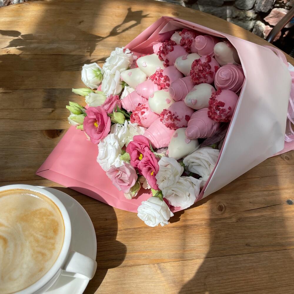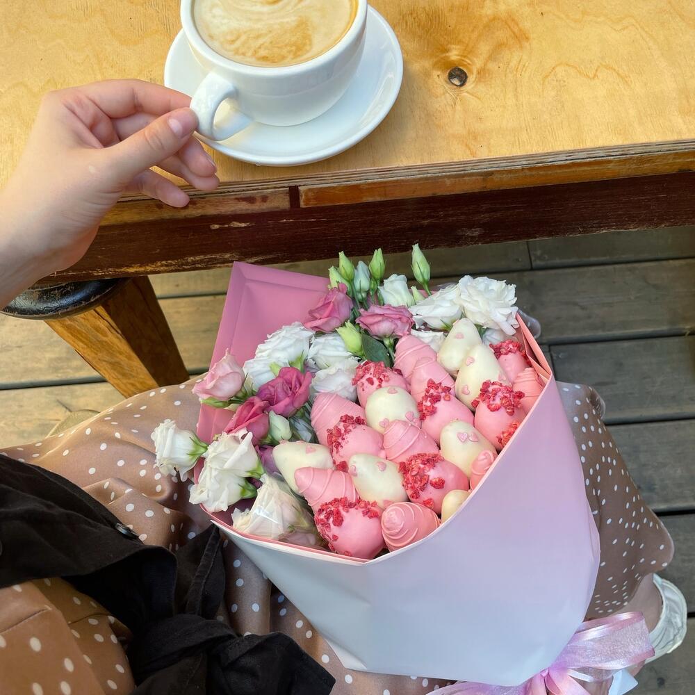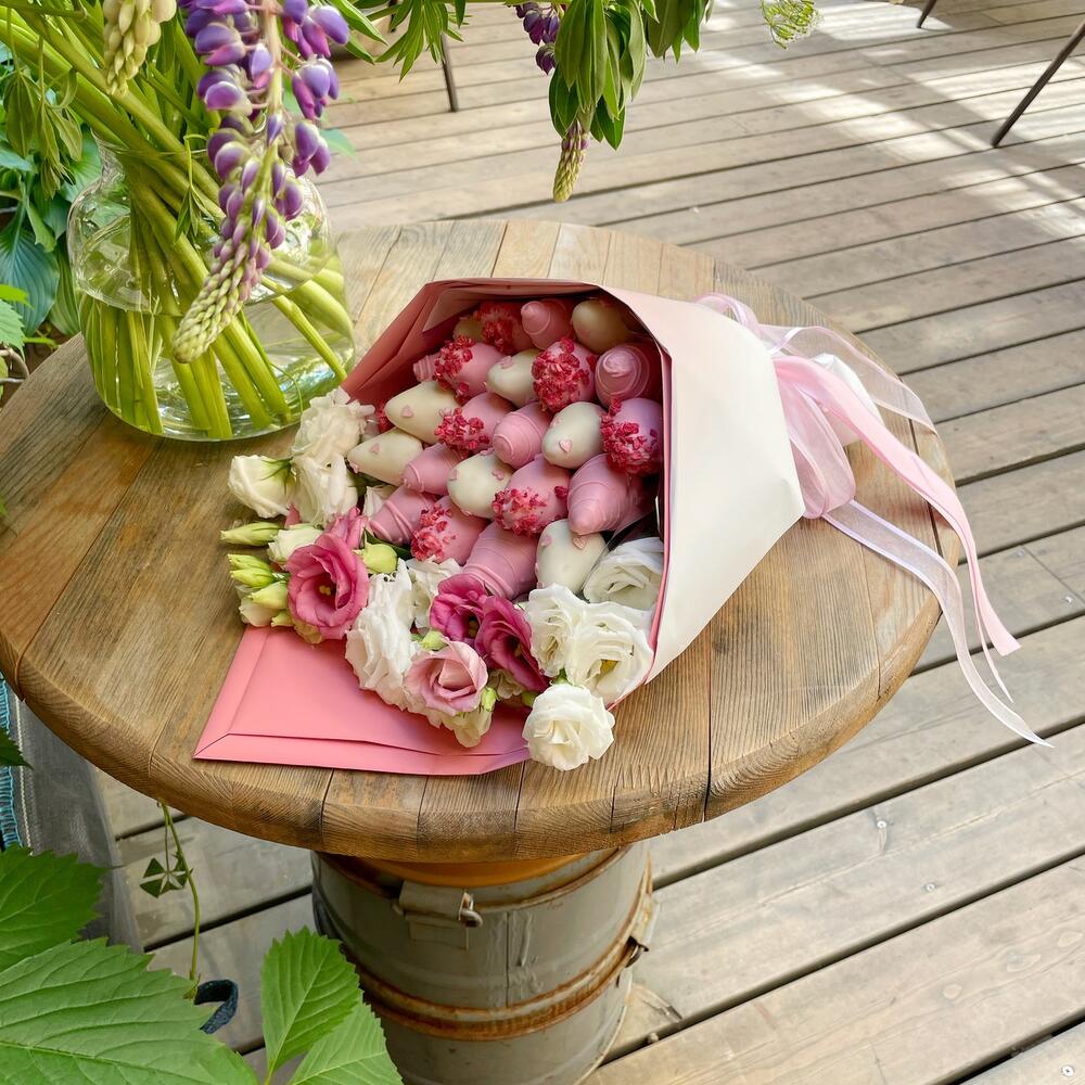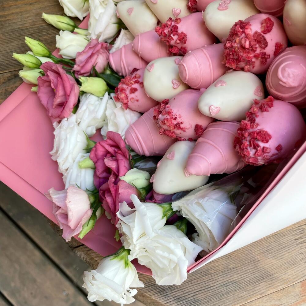 клубника свежая в бельгийском шоколаде – 600 гр.эустома розовая и белая – 5 шт.