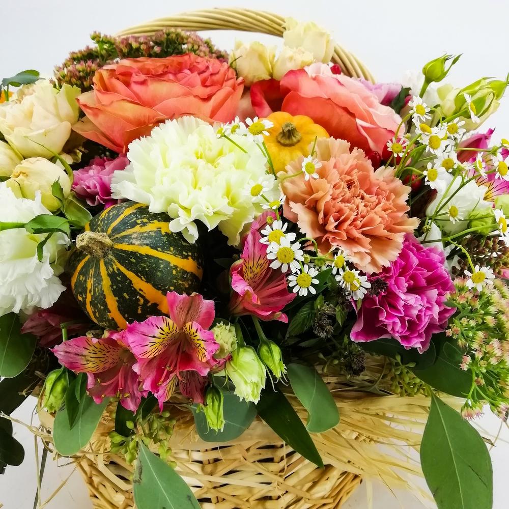 Альстромерия – 5 шт.Лизиантус – 4 шт.Мята – 10 шт.Седум – 1 шт.Эвкалипт Микс – 5 шт.Роза кахала – 3 шт.Тыква декоративная – 3 шт.