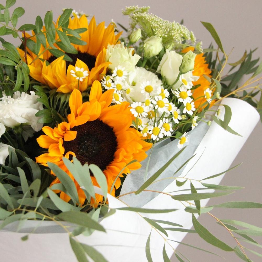 Яркий солнечный букет с ромашками, подсолнухами, лизиантусом и травами.Стильное цветочное решение для любого случая