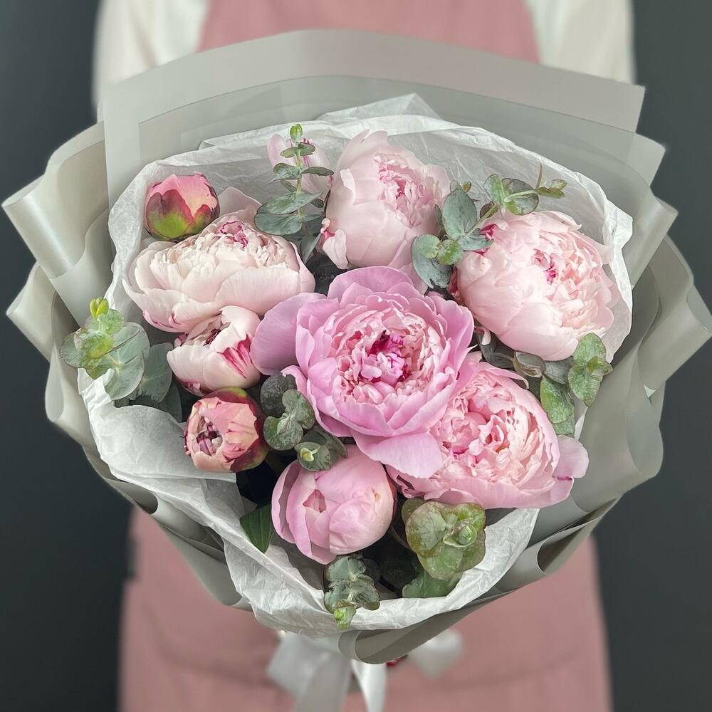 Пион – 9 шт.Эвкалипт – 3 шт.Лента атласная – 1 шт.Бумага тишью – 1 шт.бумага дизайнерская – 5 шт.