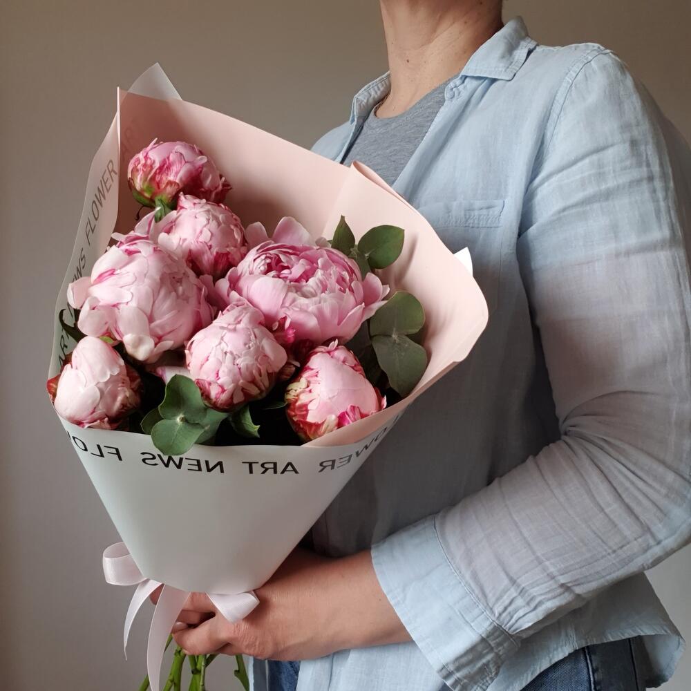 Пион – 7 шт.Эвкалипт – 2 шт.Упаковка – 3 шт.Лента атласная – 1 шт.