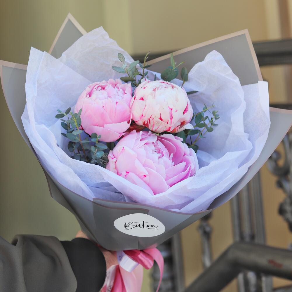 Эвкалипт – 1 шт.Пион Сара Бернар – 3 шт.Открыточка с вашими пожеланиями – 1 шт.Шоколадка – 1 шт.Дизайнерская упаковка – 1 шт.