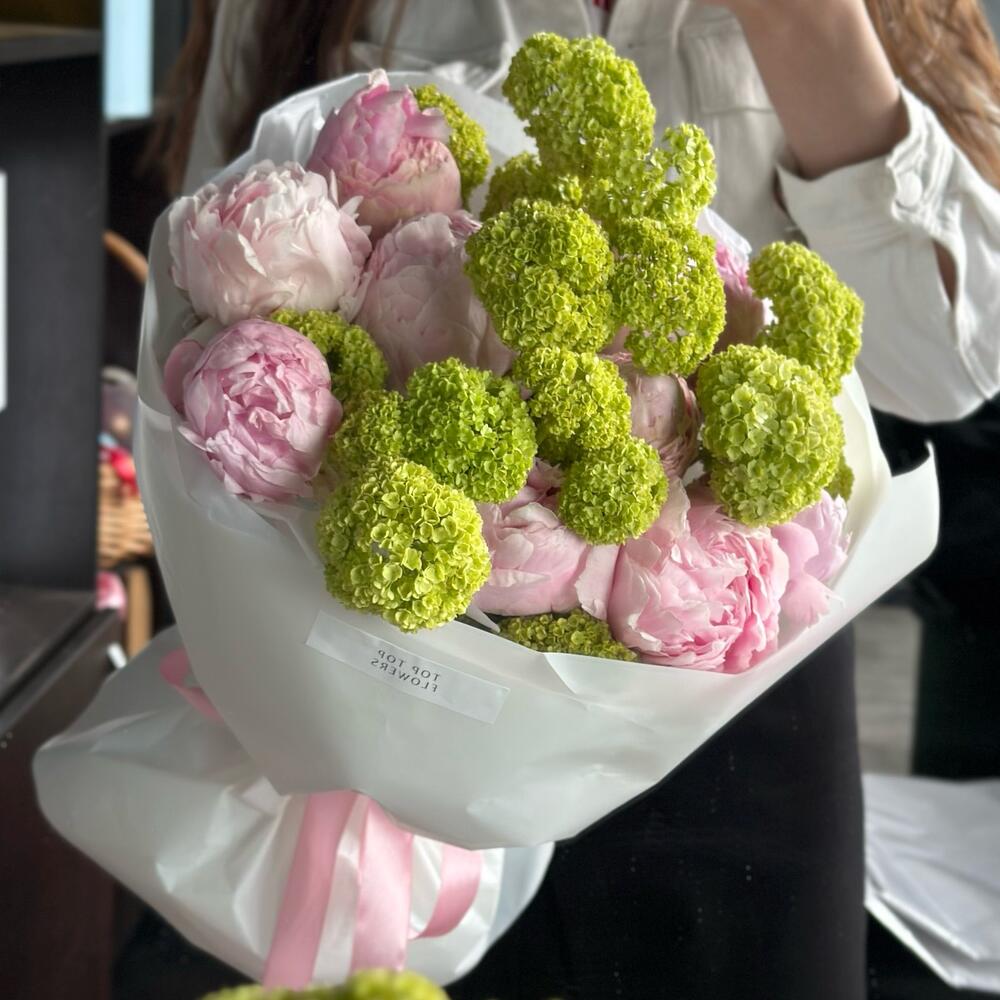 Вибурнум – 4 шт.Пион – 9 шт.Упаковка дизайнерская – 1 шт.Средство для продления жизни цветов – 1 шт.любовь флориста – 100500 шт.