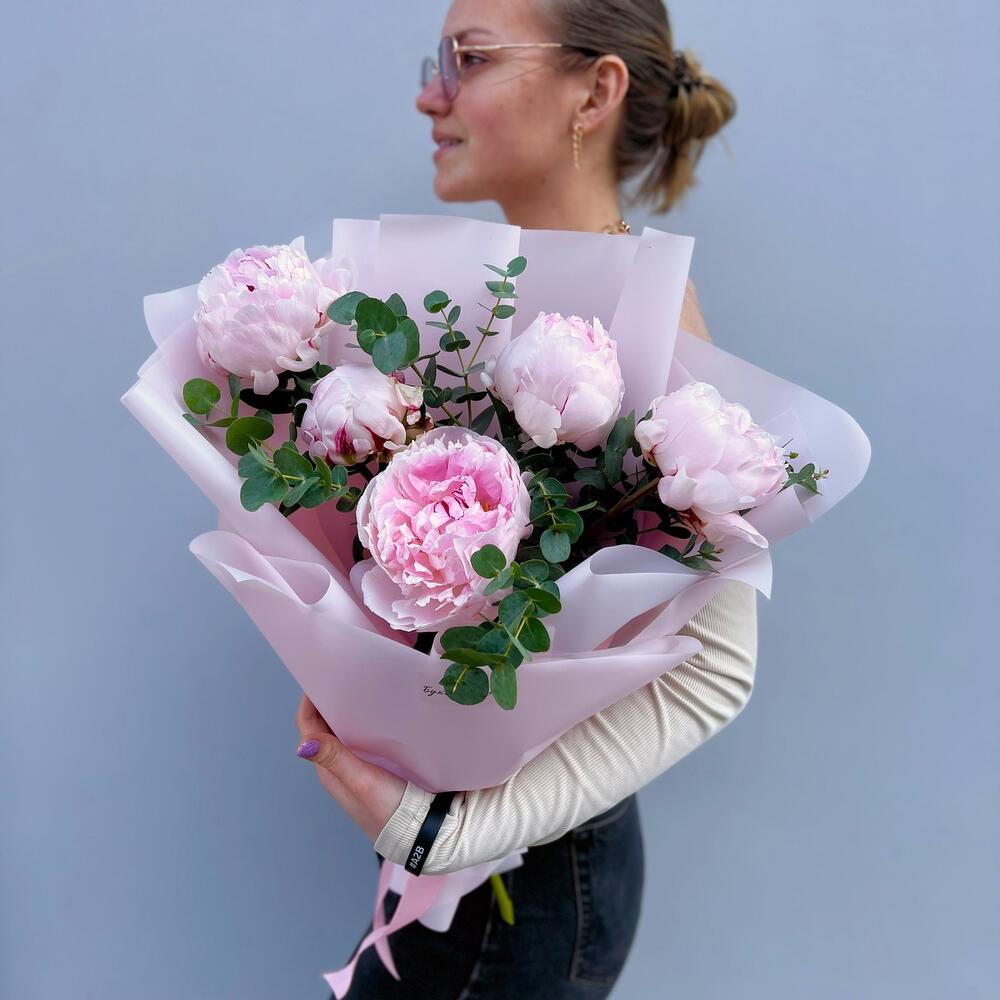 Эвкалипт – 1 шт.Лента атласная – 1 шт.Пион Сара Бернар – 5 шт.Пленка дизайнерская – 2 шт.