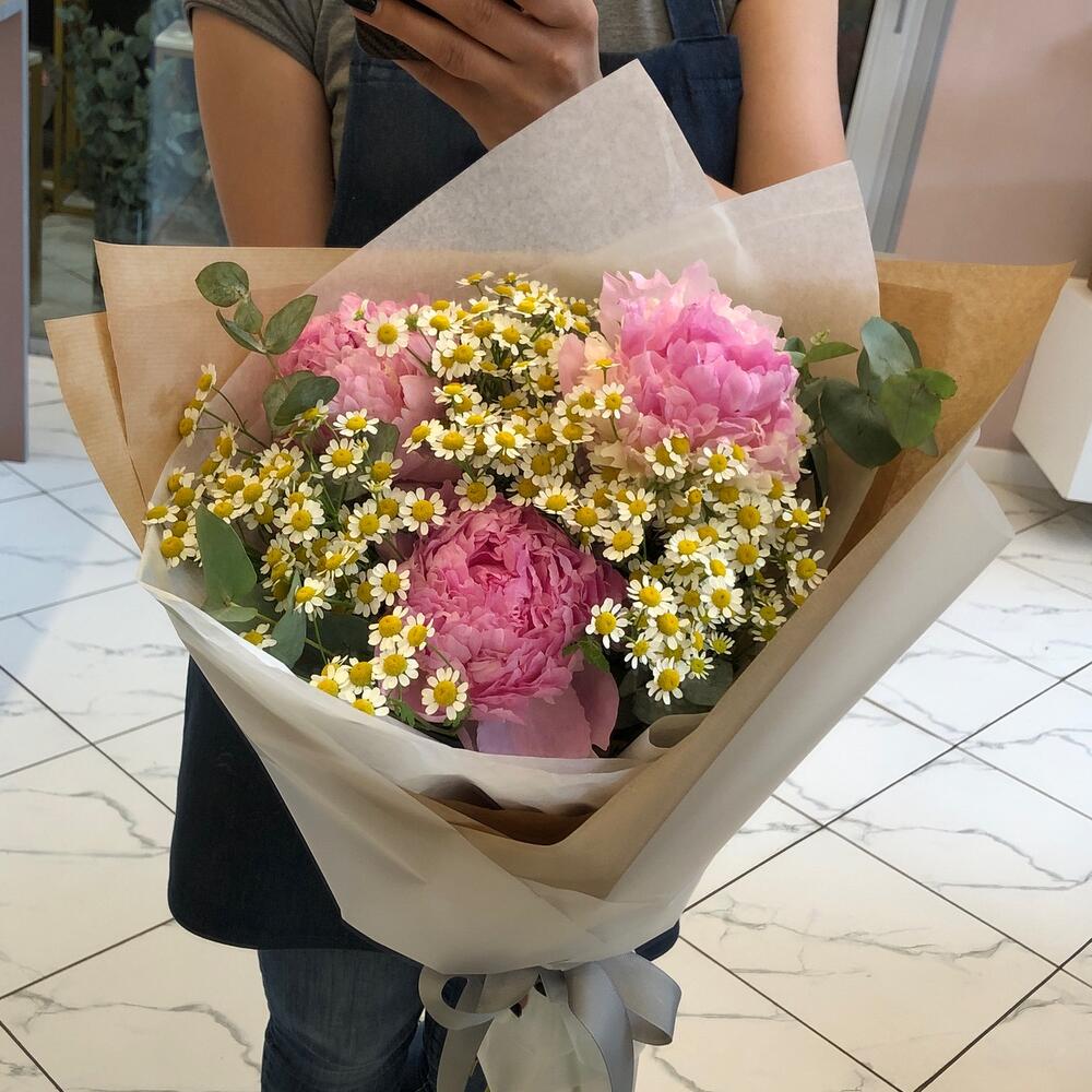Летний букет с пионами и ромашкой