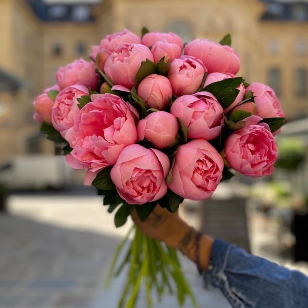 Пион розовый – 19 шт.Лента атласная – 2 шт.Открыточка с вашими пожеланиями – 1 шт.хорошее настроение – 100 шт.инструкция по уходу за цветами – 1 шт.коробка переноска – 1 шт.Кризал – 1 шт.