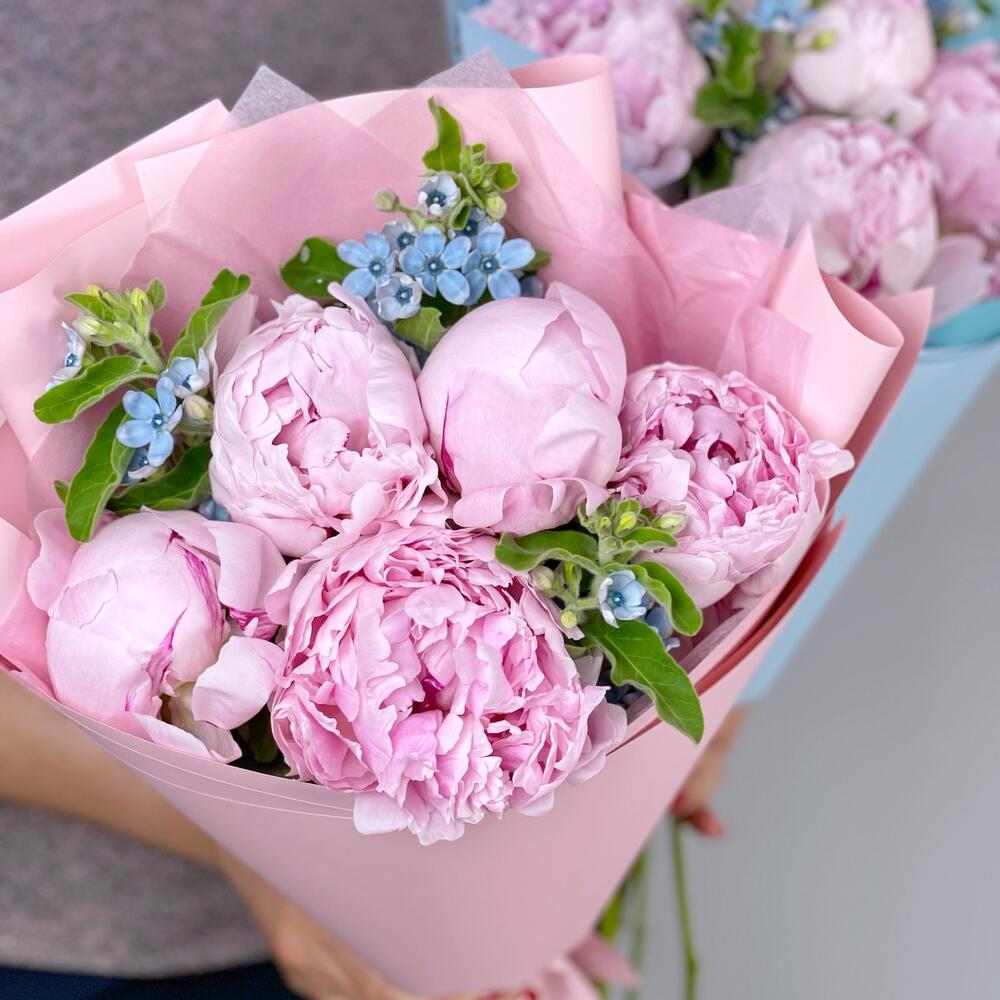 Один из самых красивых и нежных сортов пионов – Сара Бернар с удивительным пышным махровым раскрытием бутона и тонким ароматом. Мы добавили к пионам небесно голубую твидию, которая так похожа на нежные незабудки.Милый и очень трогательный букет придётся по вкусу Вашей любимой!
