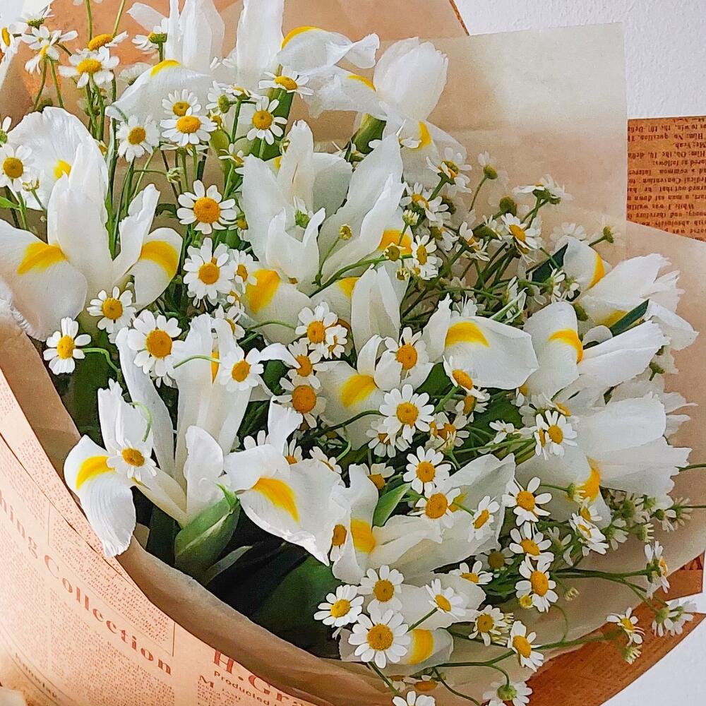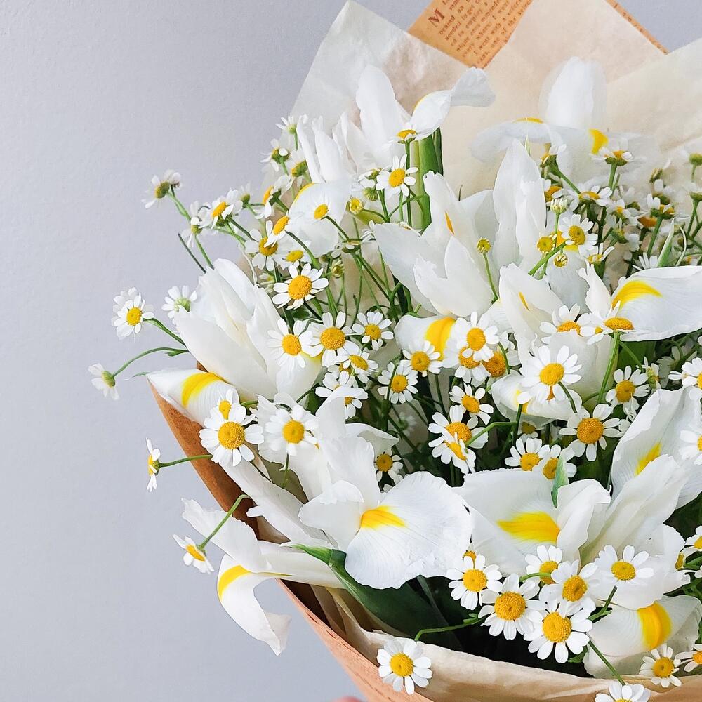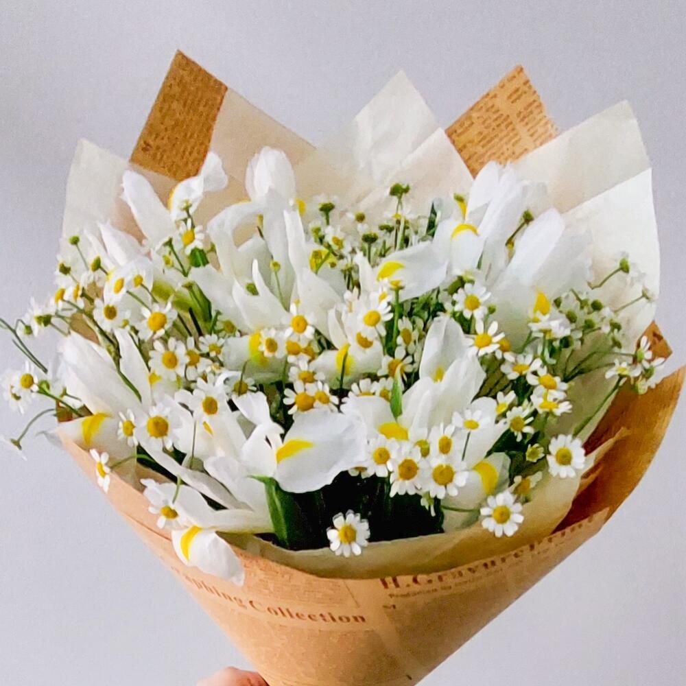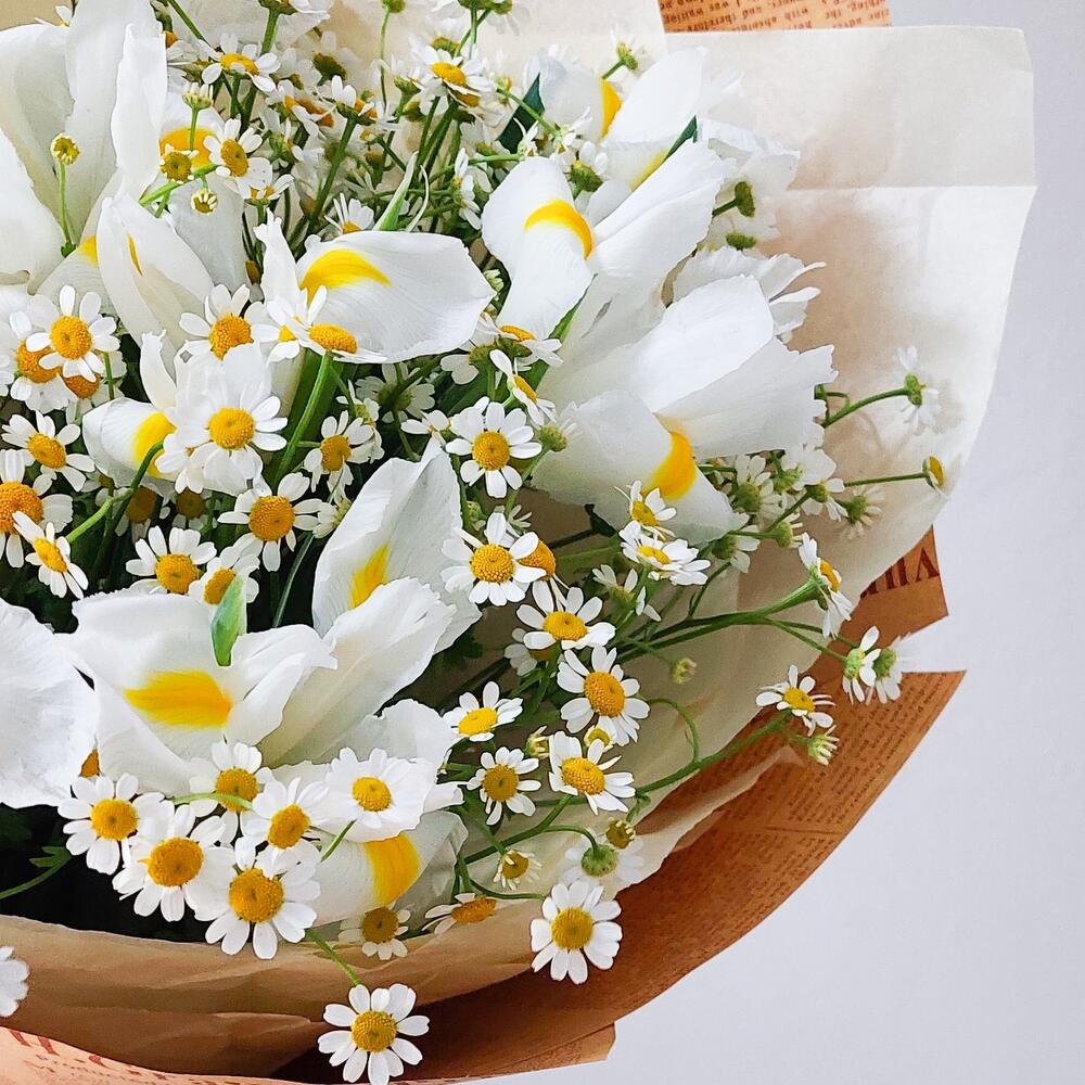 Нежный букет из белых ирисов и ромашек в крафте