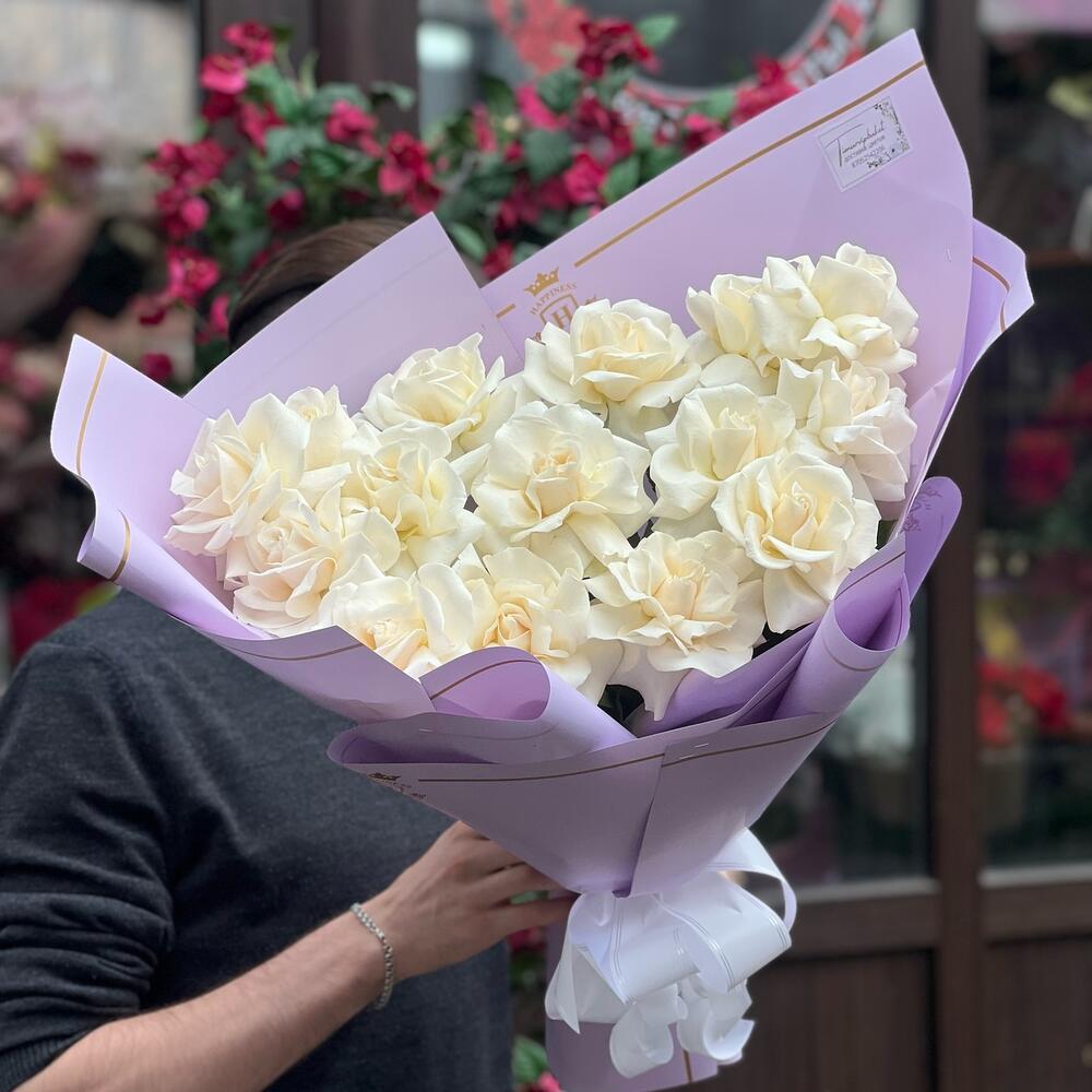 Роза голландия – 15 шт. Упаковка дизайнерская – 5 шт. Лента – 1 шт.