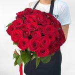 Эффектный букет из 45 роз будет уместен на подарок роскошной женщине. Также таким букетом можно признаться в своих самых искренних чувствах.