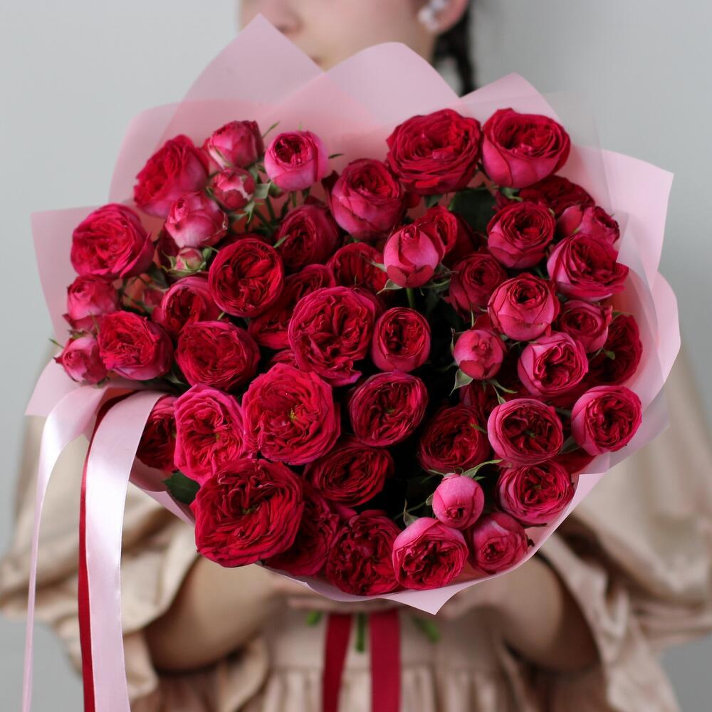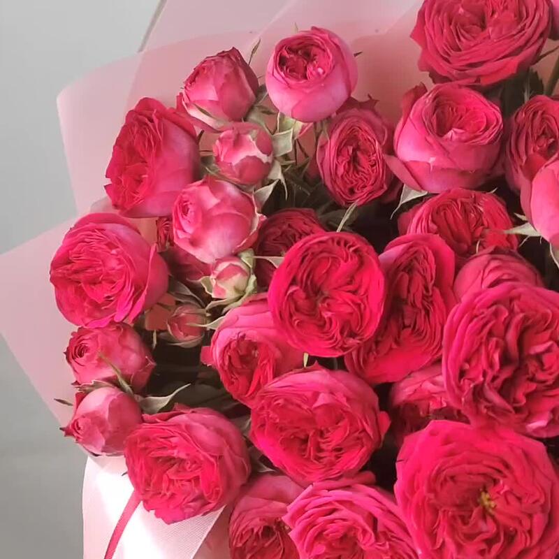 Лента атласная – 1 шт.Кустовая роза пионовидная – 9 шт.Матовая пленка – 3 шт.