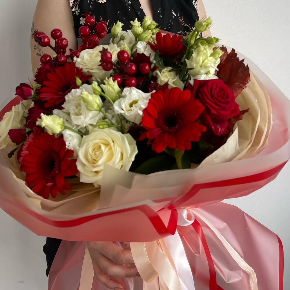 герберы – 7 шт.Эустома – 4 шт.Роза белая – 5 шт.Роза кустовая – 3 шт.Роза красная – 1 шт.Ягоды декоративные – 5 шт.Листья Дуба – 2 шт.Салал пучок – 1 шт.Тишью – 2 шт.Пленка матовая – 6 шт.Лента атласная – 2 шт.