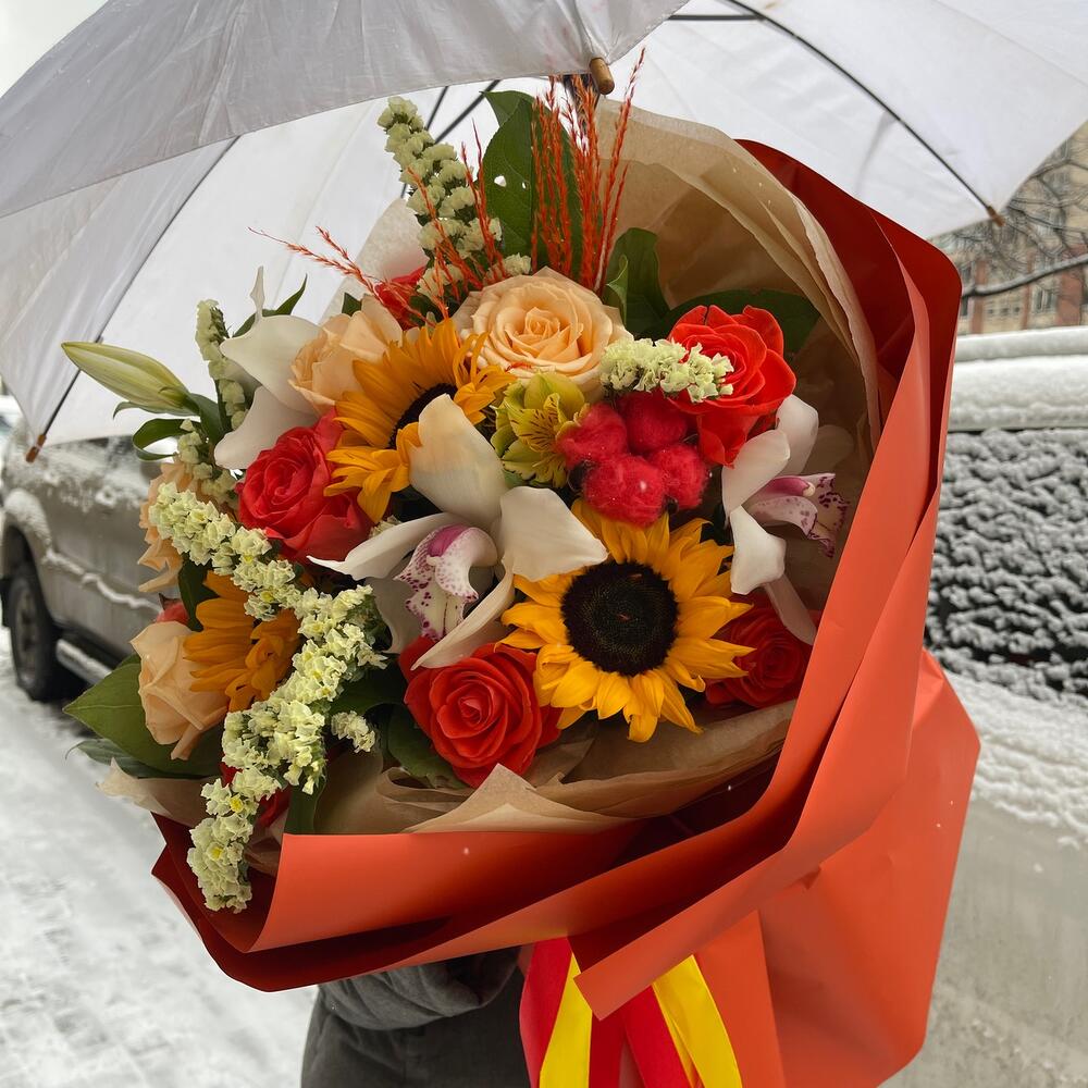 Альстромерия – 1 шт.Орхидея Цимбидиум – 3 шт.Статица – 3 шт.Роза Россия – 9 шт.Подсолнух – 3 шт.Пленка матовая – 6 шт.Салал пучок – 1 шт.сухоцвета – 10 шт.