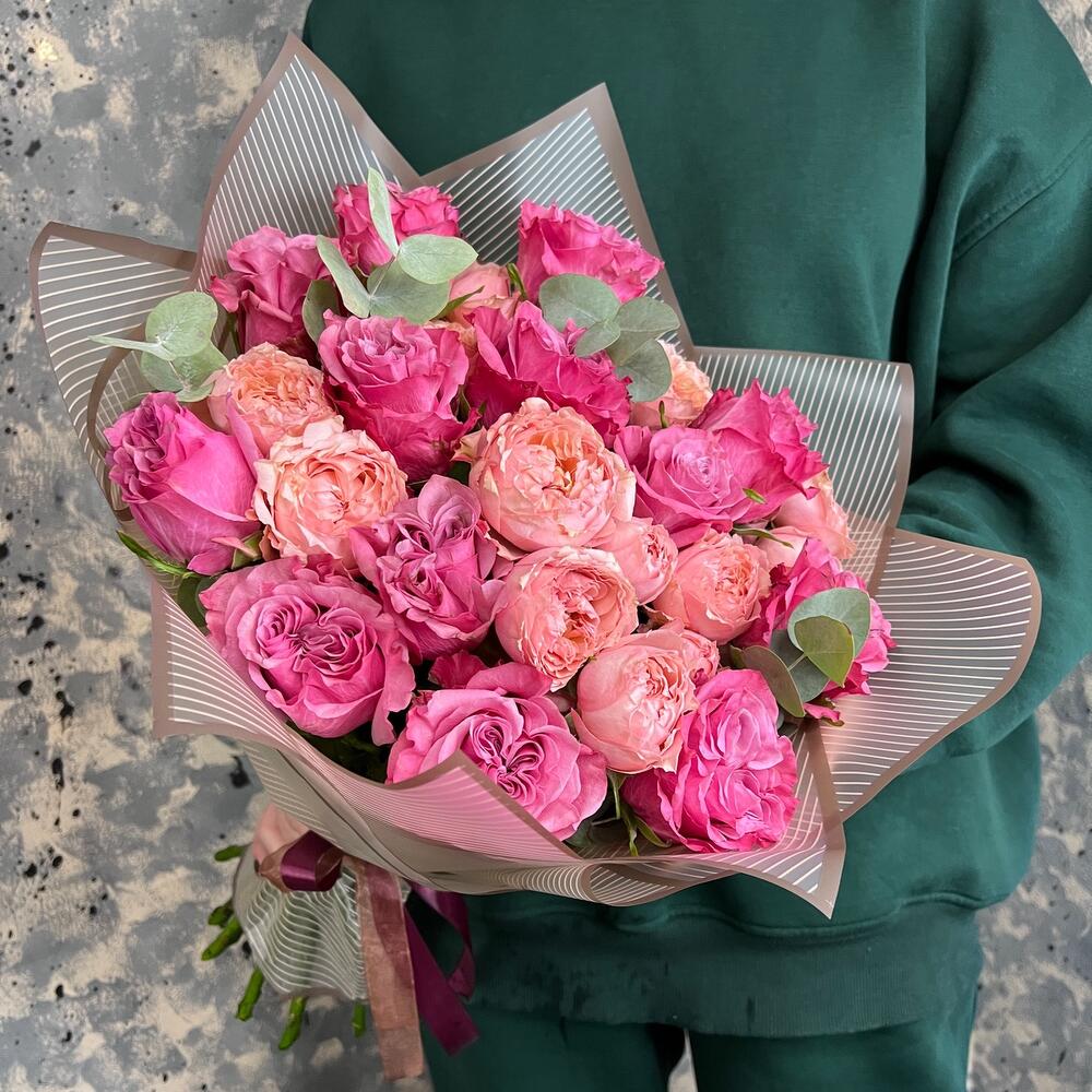 роза пионовидная кантри блю – 13 шт.роза пионовидная кустовая джульетта – 5 шт.Эвкалипт – 3 шт.Пленка матовая – 3 шт.Лента атласная – 2 шт.