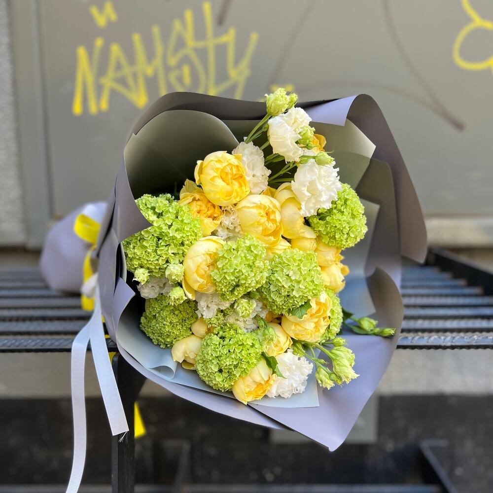 Вибурнум – 3 шт.Лента атласная – 2 шт.Пленка матовая – 7 шт.эустома махровая белая – 3 шт.роза кустовая пионовидная желтая – 5 шт.