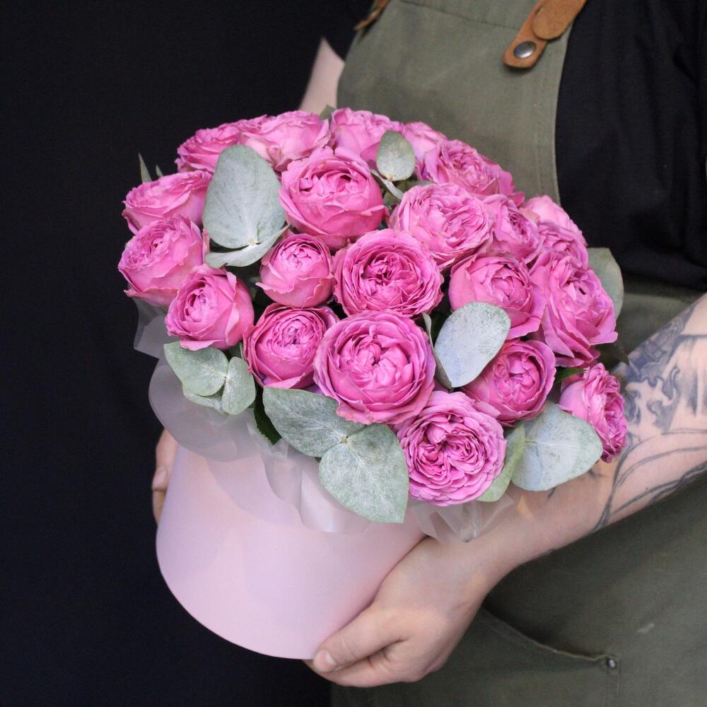 Эвкалипт – 3 шт.Шляпная коробка – 1 шт.Оазис флористический – 1 шт.Пленка дизайнерская – 2 шт.роза кустовая пионовидная misty bubbles – 11 шт.
