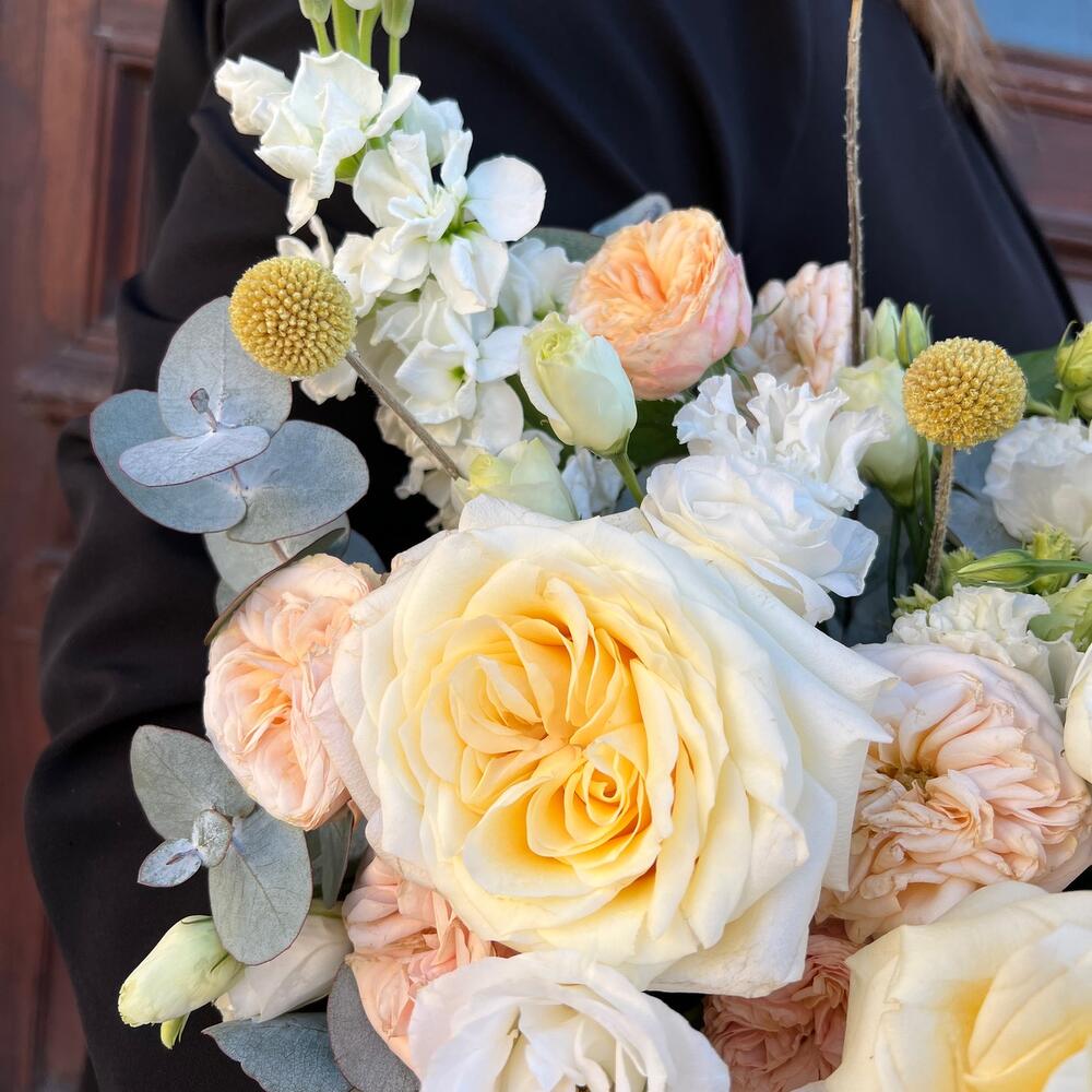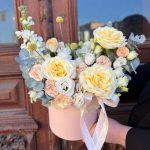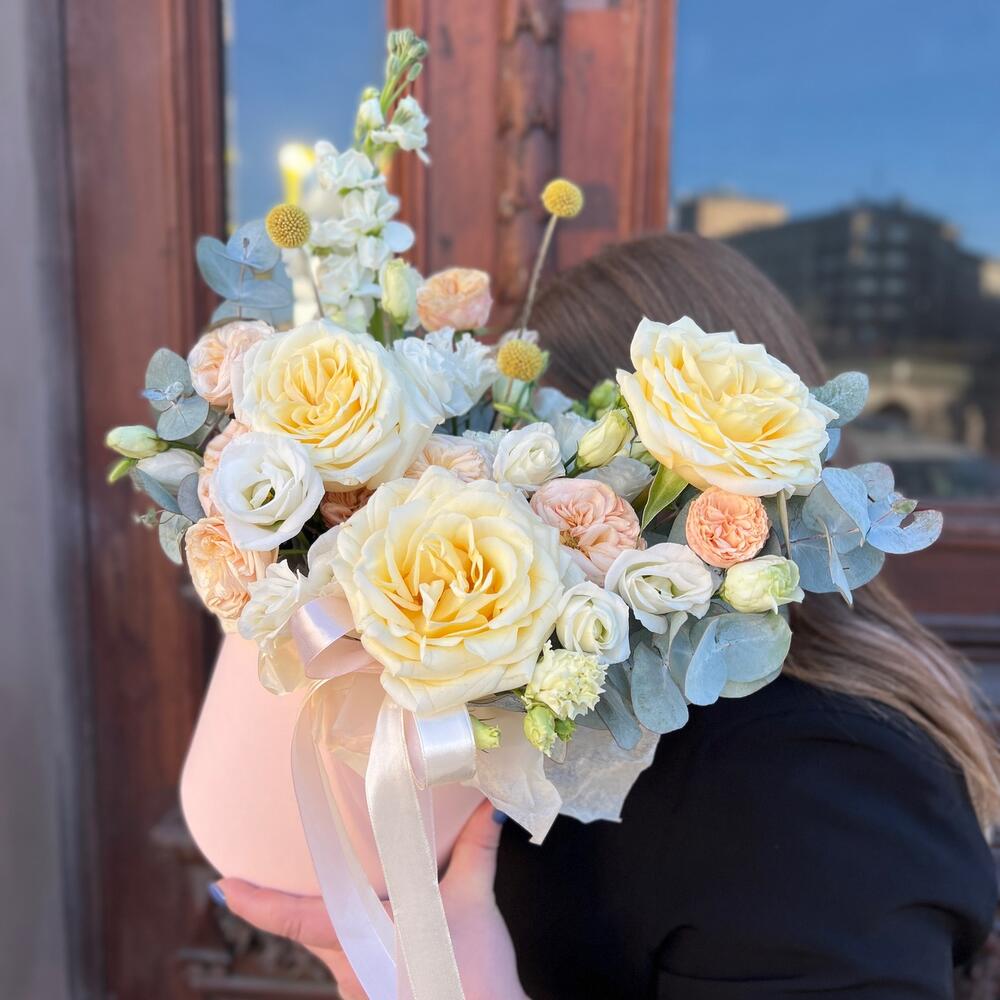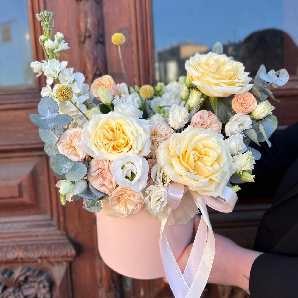 роза кэндллайт – 3 шт.роза кустовая пионовидная трендсеттер – 2 шт.Краспедия – 3 шт.эустома махровая белая – 1 шт.эустома розита вайт – 1 шт.Маттиола – 1 шт.Эвкалипт – 3 шт.Оазис флористический – 1 шт.Коробка шляпная – 1 шт.Лента атласная – 2 шт.