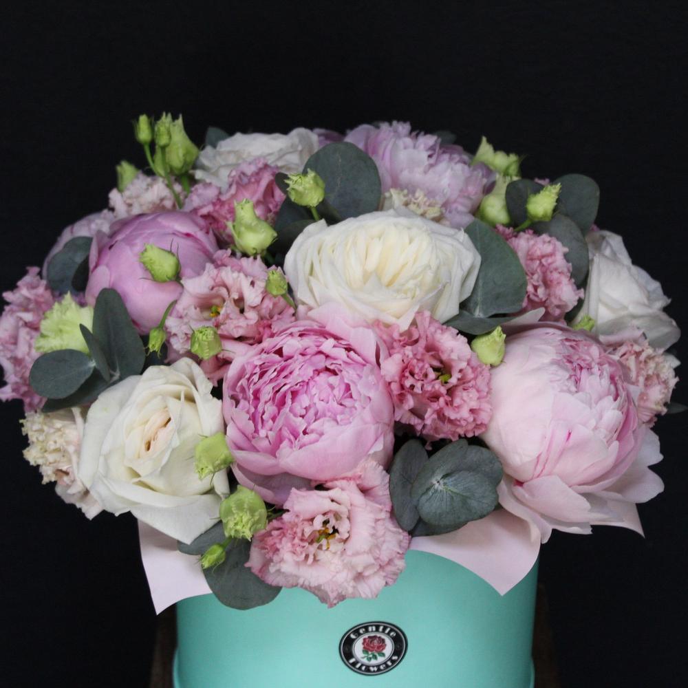 Эвкалипт – 3 шт.Эустома – 3 шт.Коробка шляпная – 1 шт.Роза пионовидная – 5 шт.Пион Сара Бернар – 7 шт.Логотип – 1 шт.Пленка матовая – 1 шт.Оазис флористический – 1 шт.