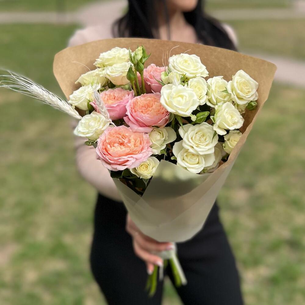 Роза кустовая пионовидная джульетта – 1 шт.роза кустовая сноулейк – 3 шт.Колосья пшеницы – 1 шт.