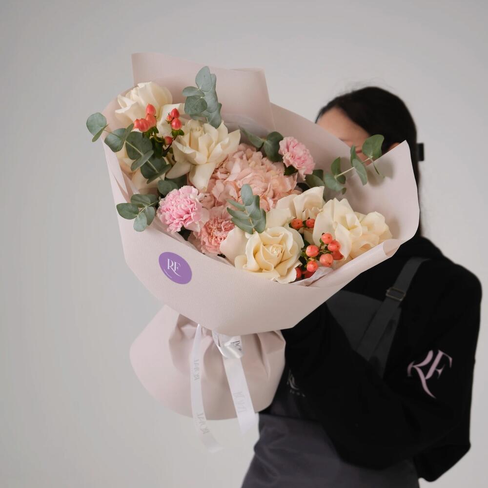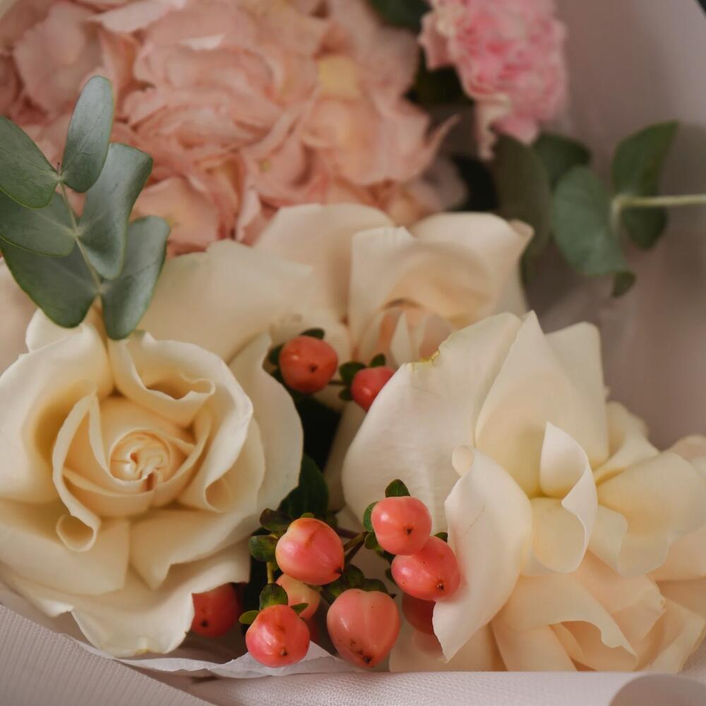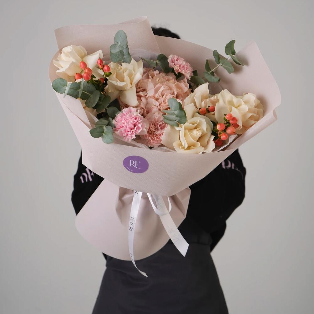 Гвоздики, Кустовые розы, Лизиантусы, Пионовидные розы, Розы
