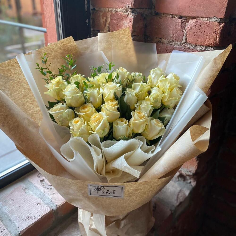 Букет из 25 белых роз и эвкалипта в крафтовой упаковке “Северный полюс”