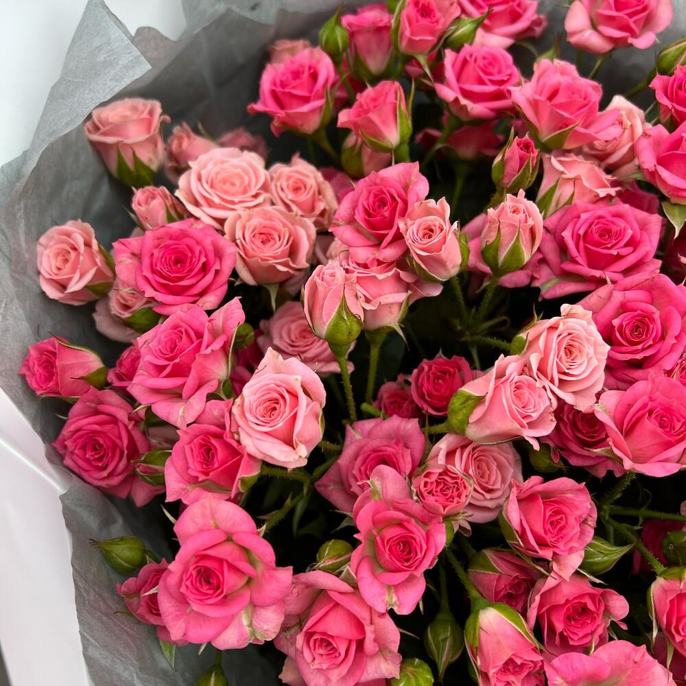 Роза кустовая 60 см – 25 шт.Дизайнерская упаковка – 3 шт.Тишью – 1 шт.Лента атласная – 2 шт.