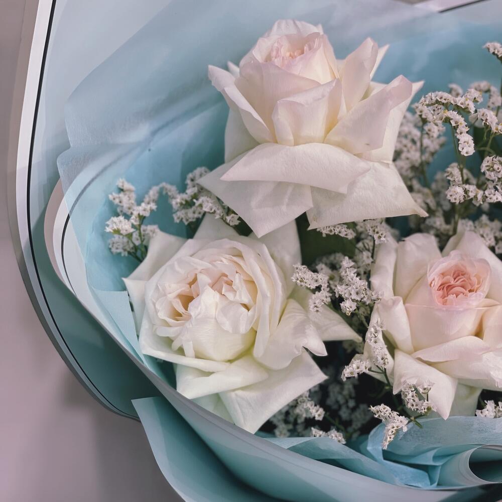 Лимониум – 4 шт.Лента атласная – 2 шт.Тишью – 2 шт.Упаковка дизайнерская – 2 шт.роза охара пионовидная – 5 шт.