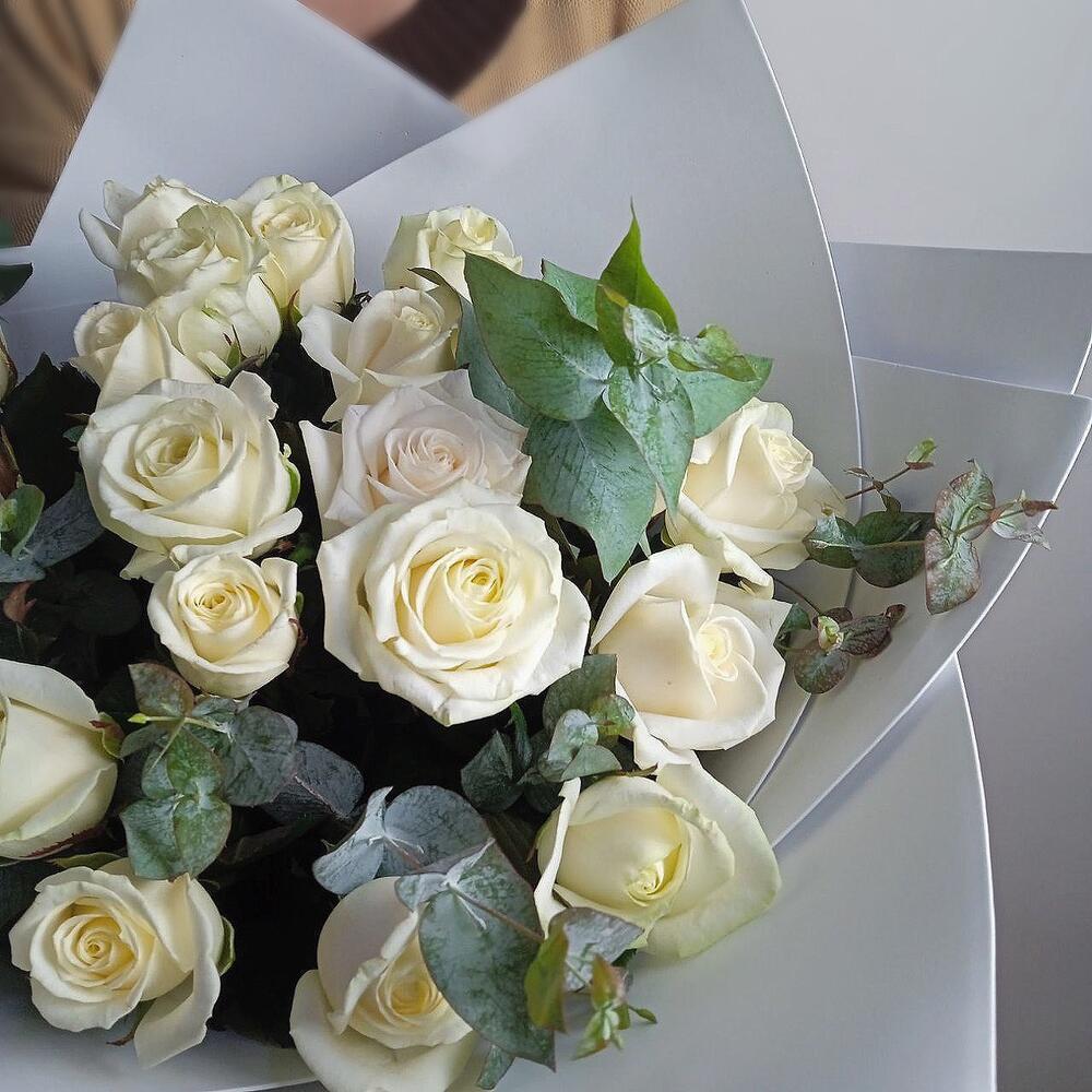 Роза – 21 шт.Эвкалипт – 6 шт.Дизайнерская упаковка – 1 шт.Лента атласная – 1 шт.подкормка для срезанных цветов – 1 шт.