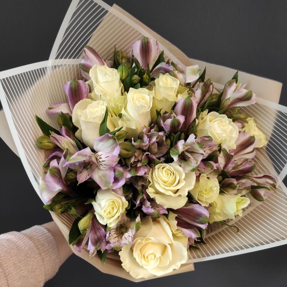 Букет из белых роз и фиолетовых альстромерий М