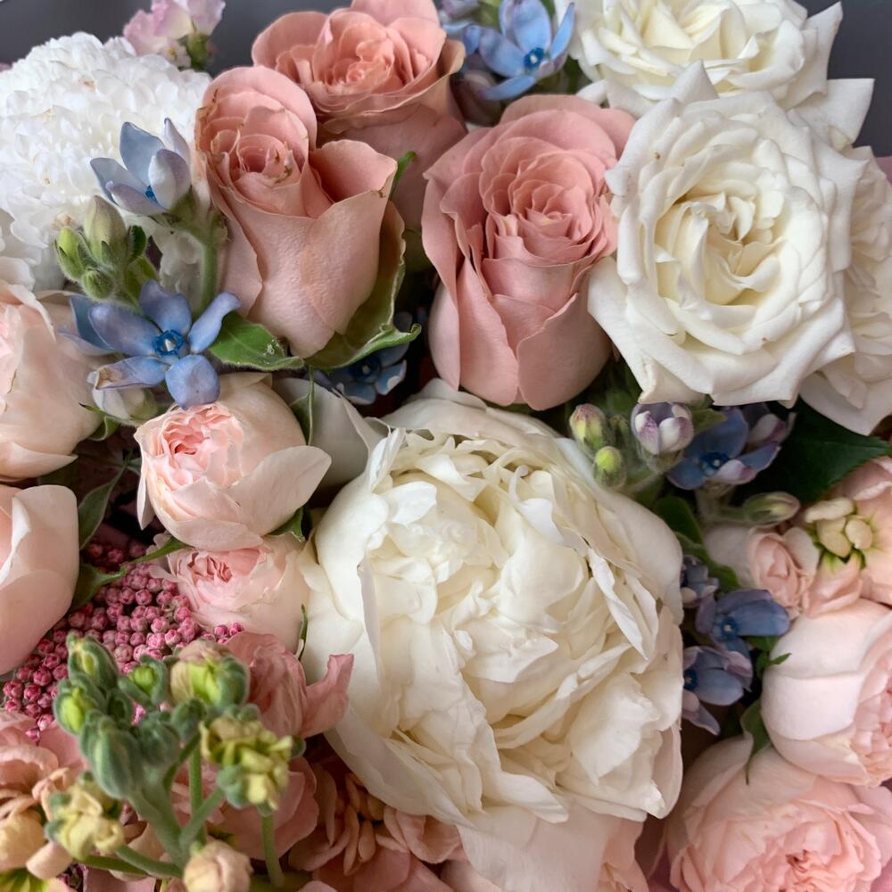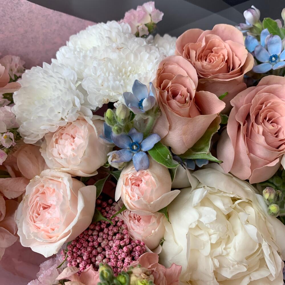 Маттиола – 3 шт.Оксипеталум – 3 шт.Статица – 1 шт.Озотамнус – 1 шт.Кустовая пионовидная роза – 4 шт.Сантини – 1 шт.декоративная упаковка – 1 шт.Атласная лента – 1 шт.