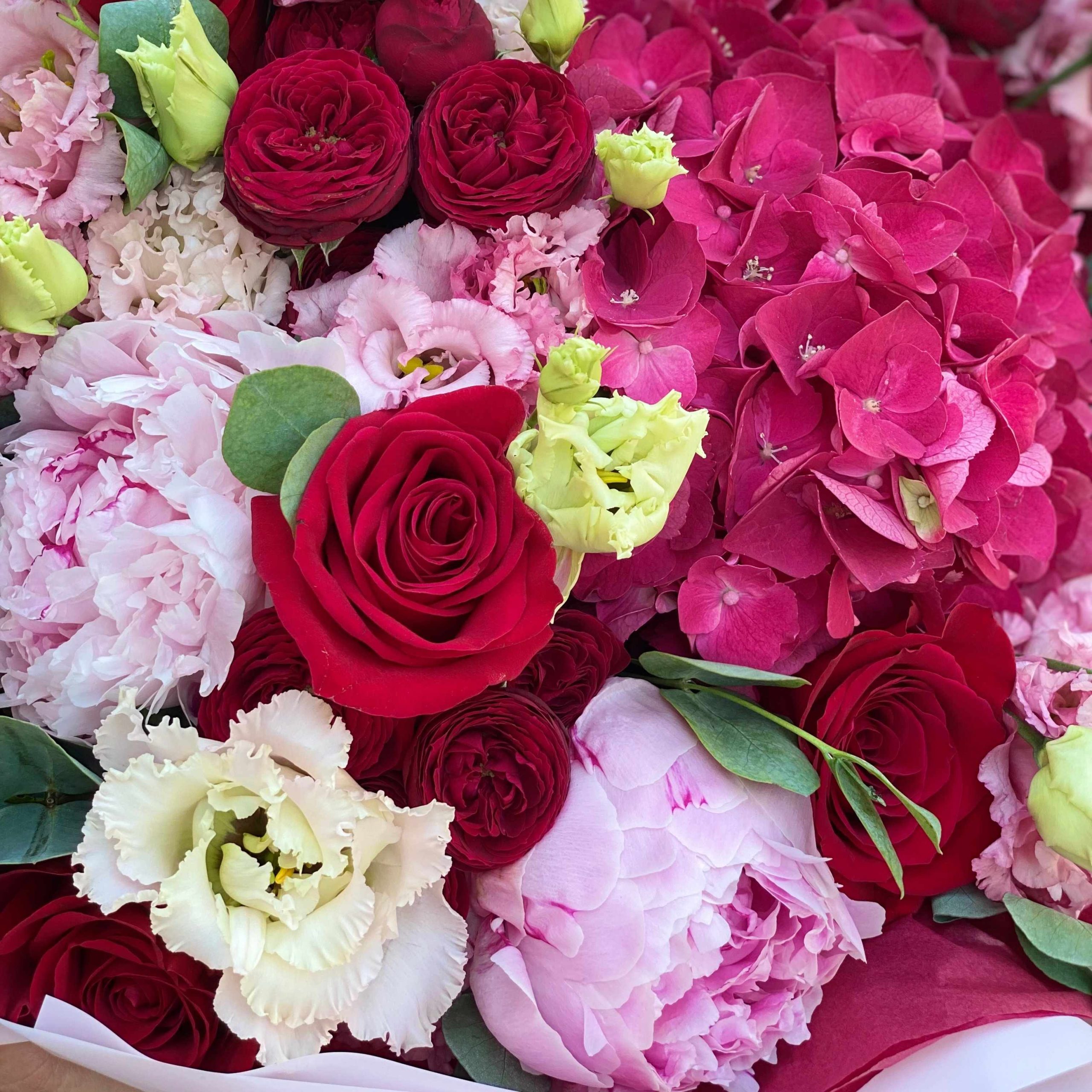 Гортензии, Кустовые розы, Лизиантусы, Пионовидные розы, Розы