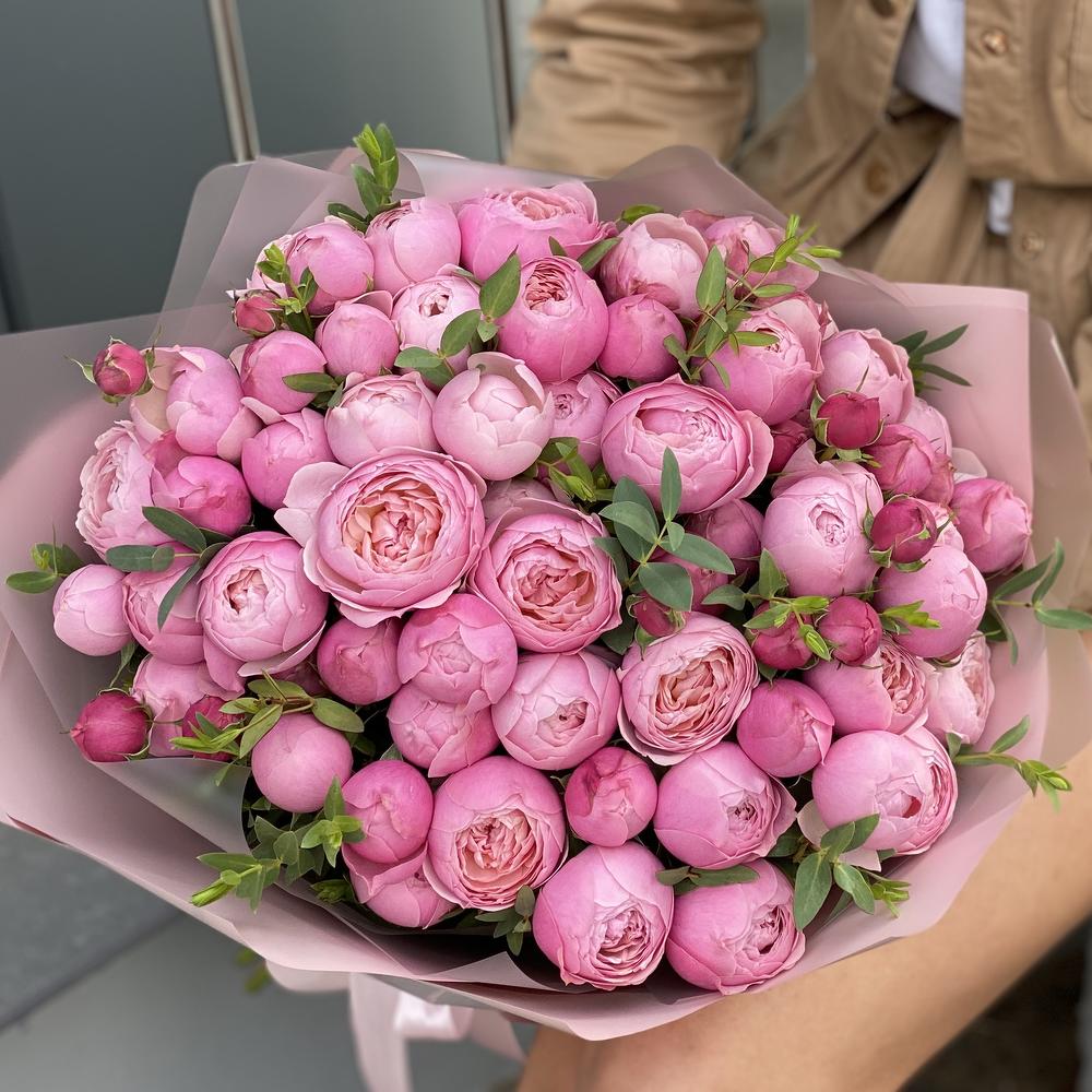 кустовая пионовидная роза сильвия пинк – 15 шт. Эвкалипт – 3 шт. Оформление – 1 шт.
