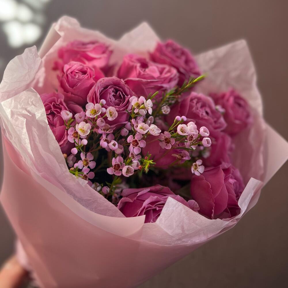 Кустовая пионовидная роза – 3 шт.Хамелациум – 1 шт.декоративная упаковка – 1 шт.Атласная лента – 1 шт.