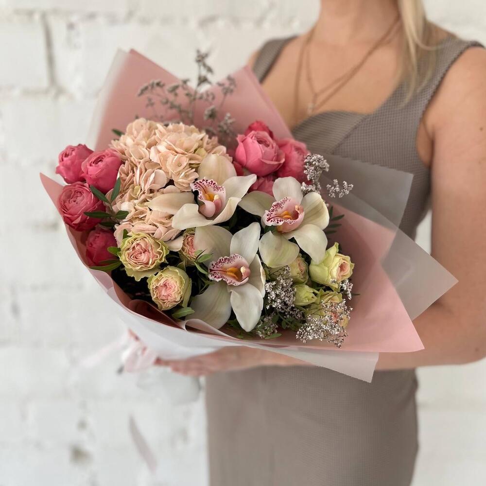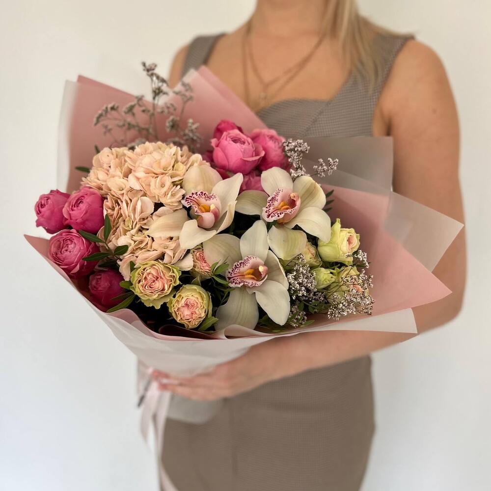 Гортензия – 1 шт.Лимониум – 3 шт.Роза кустовая – 2 шт.орхидея – 3 шт.Кустовая пионовидная роза – 2 шт.Упаковка дизайнерская – 3 шт.