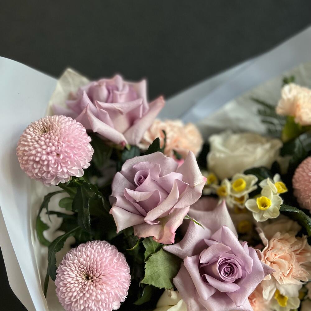 Букет из пионовидных роз, нарциссов и хризантемы