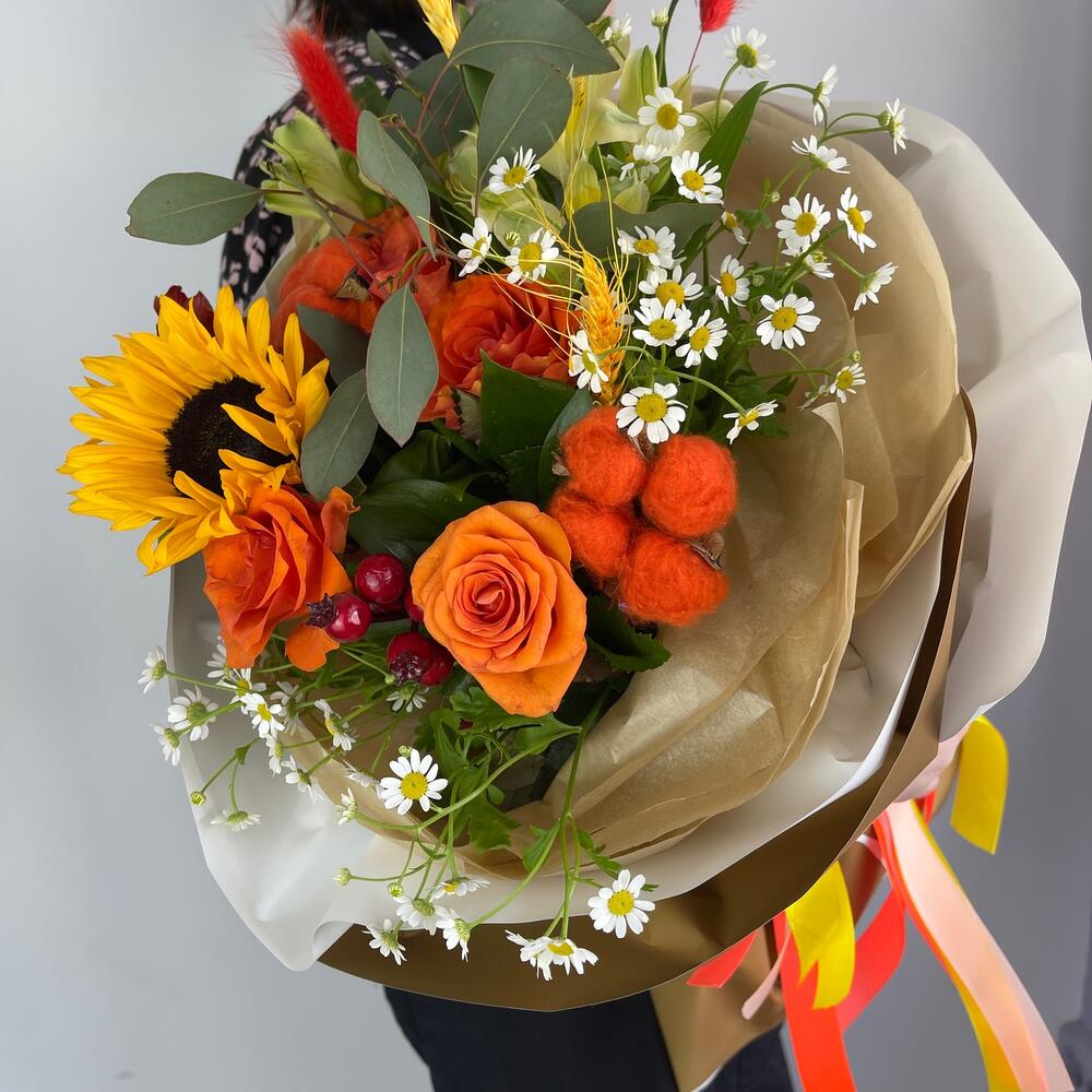Альстромерия – 2 шт.Эвкалипт – 1 шт.Лента атласная – 2 шт.Роза Россия – 5 шт.Подсолнух – 1 шт.Рускус сочи – 5 шт.Пленка матовая – 4 шт.Хлопок натуральный – 2 шт.Лагурус (сухоцвет) – 3 шт.колосок полевой – 1 шт.ромашки кустовые – 2 шт.