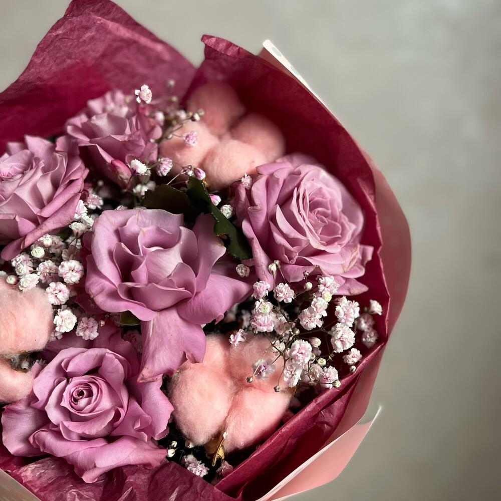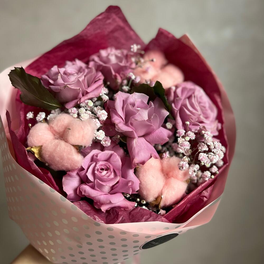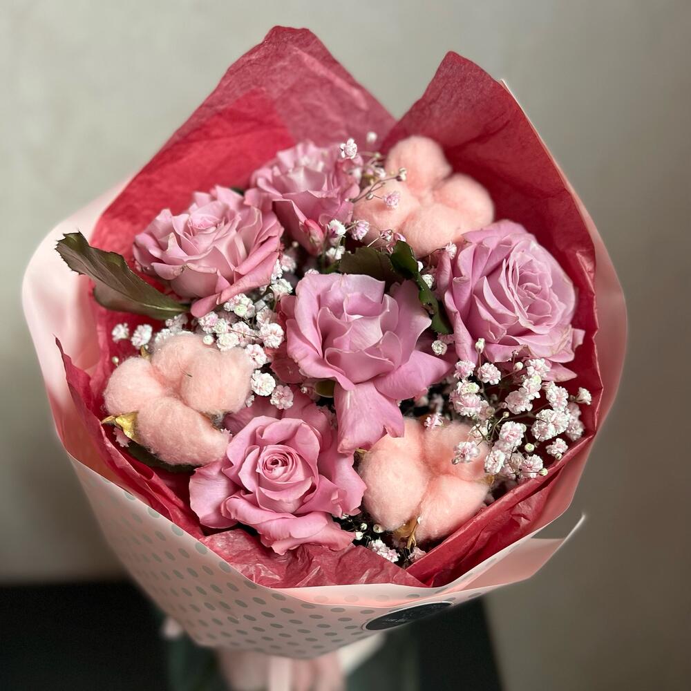 Роза – 5 шт.Гипсофила – 2 шт.Хлопок – 3 шт.декоративная упаковка – 1 шт.Атласная лента – 1 шт.